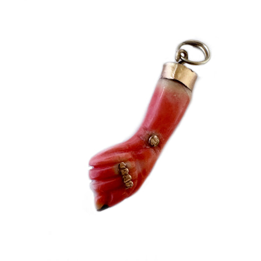 Victorian Coral Figa Hand Pendant, 14k Gold Amulet, Evil Eye Talisman