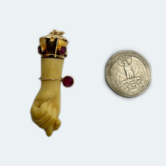 Antique Victorian Bone Figa Pendant with 9k Gold Details and Coral Rose, 19th-Century Italian Mano Fico Amulet