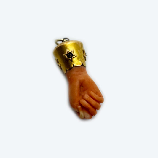 Antique 18k Gold Mediterranean Coral Figa Charm, Victorian Lucky Amulet Diamonds