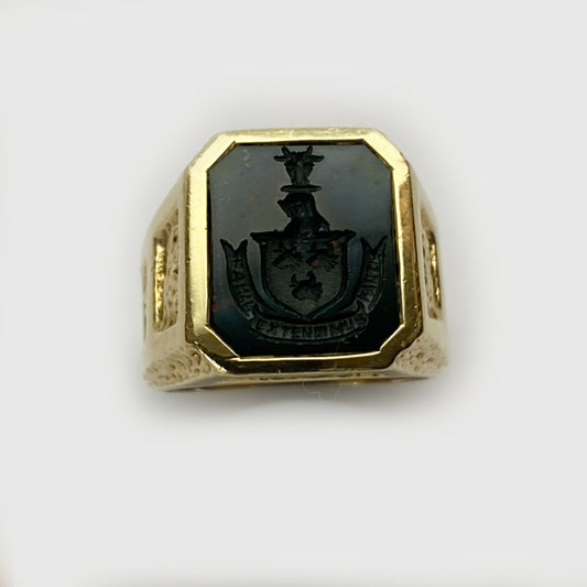 Antique 14k Gold Intaglio Ring, Heraldic Coat Of Arms Motto, Blood Stone Signet Ring