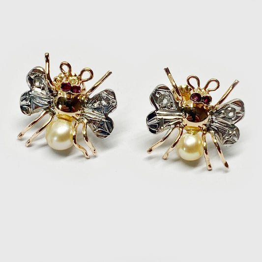 Antique 18k Gold Insect Bees Art Deco Stud Earrings