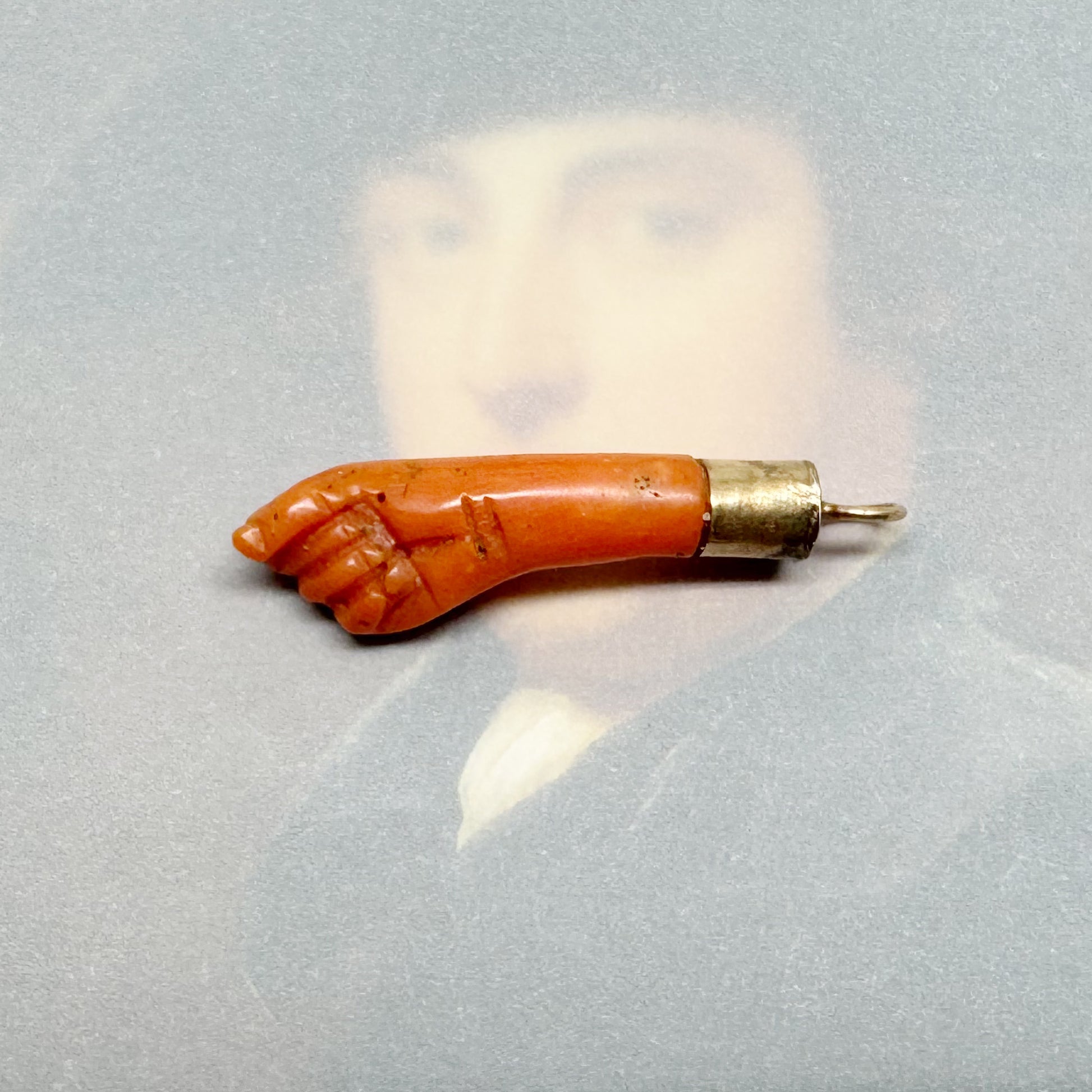 The figa charm is in good antique/used condition with small signs of ageing on its surface - the coral has an uneven aged/used natural quality to it, to which in my opinion only adds to its extraordinary appeal. Antique items are almost always pre-worn and will typically have some level of wear. Please refer to images.