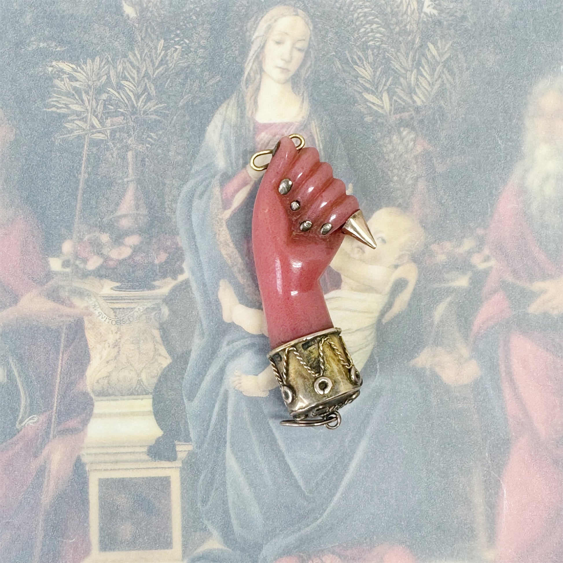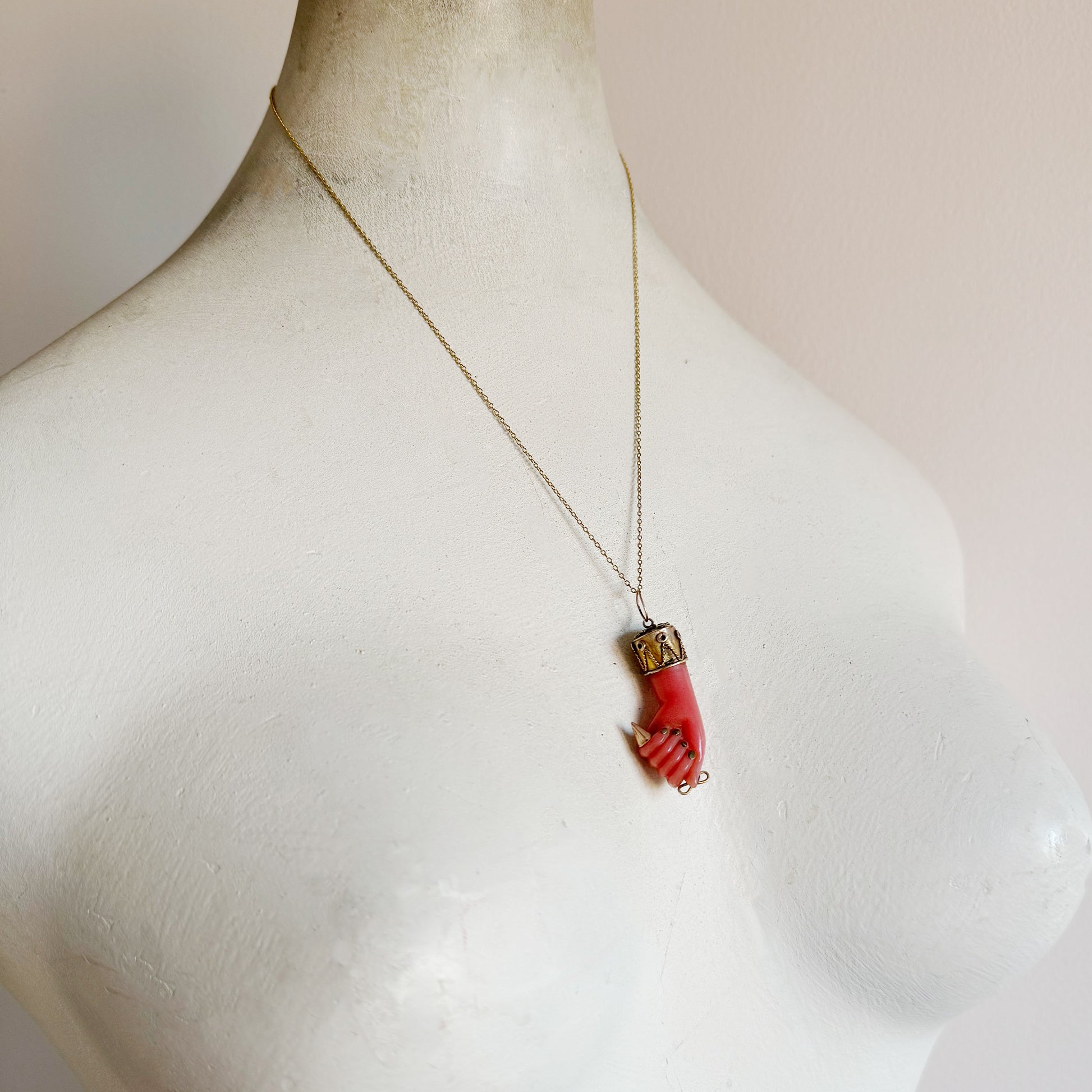 The hand is beautifully mounted on its original, ornate 10k gold casing, complete with a 10k gold bail and delicate gold nails. Although unmarked, this piece has been acid-tested and confirmed as 10k gold.