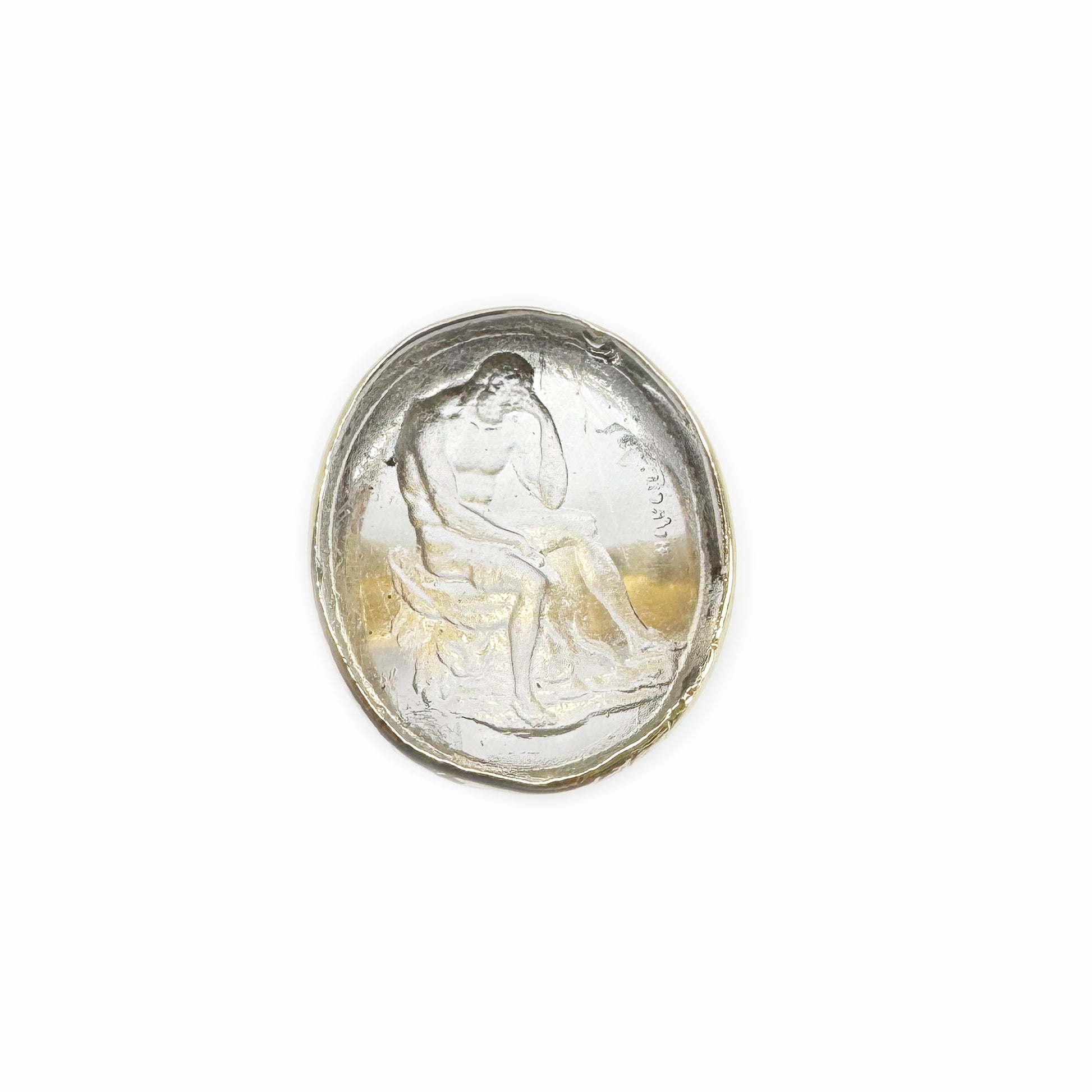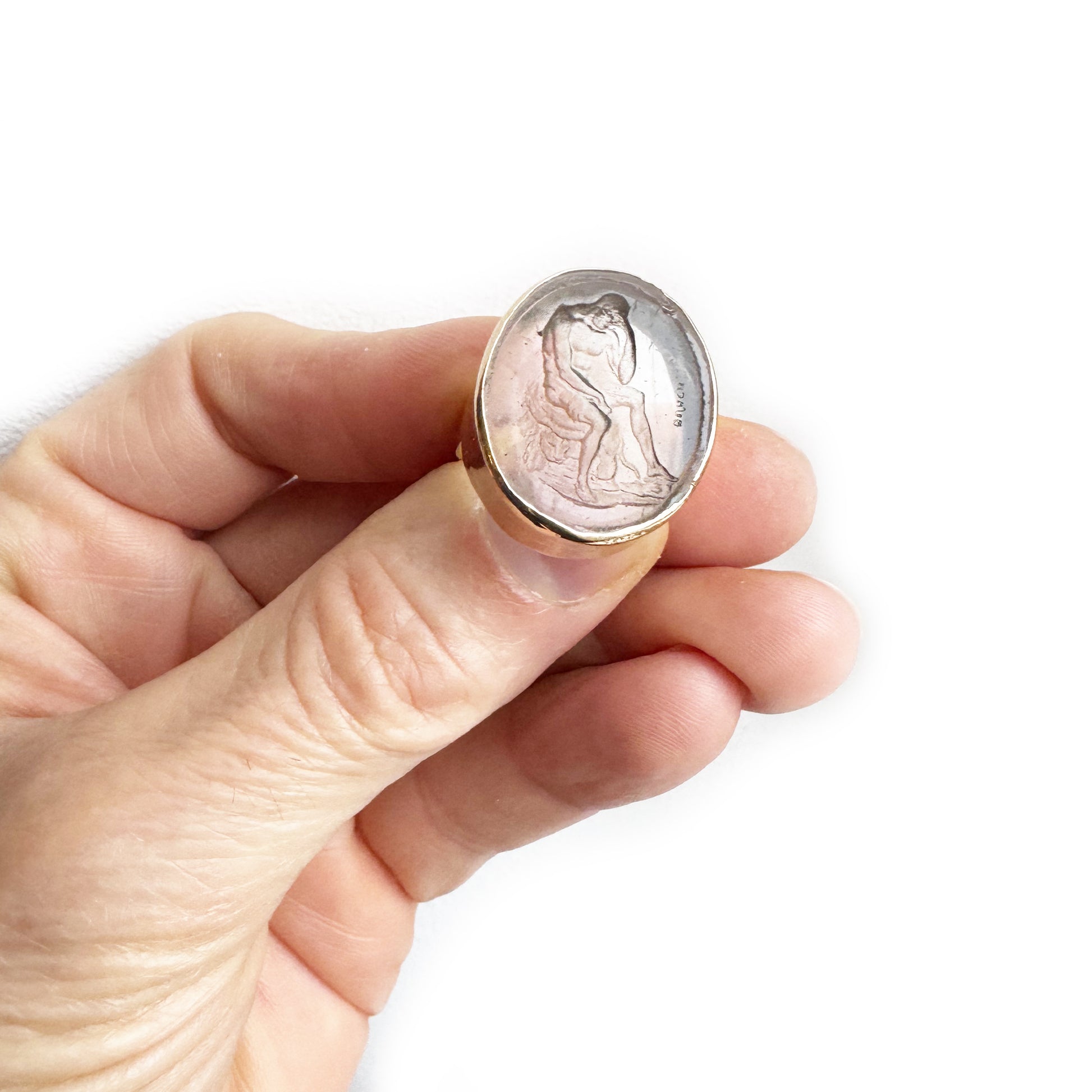 A distinguished and large antique 10k gold intaglio ring showcasing a Victorian-era clear glass intaglio with striking detail.