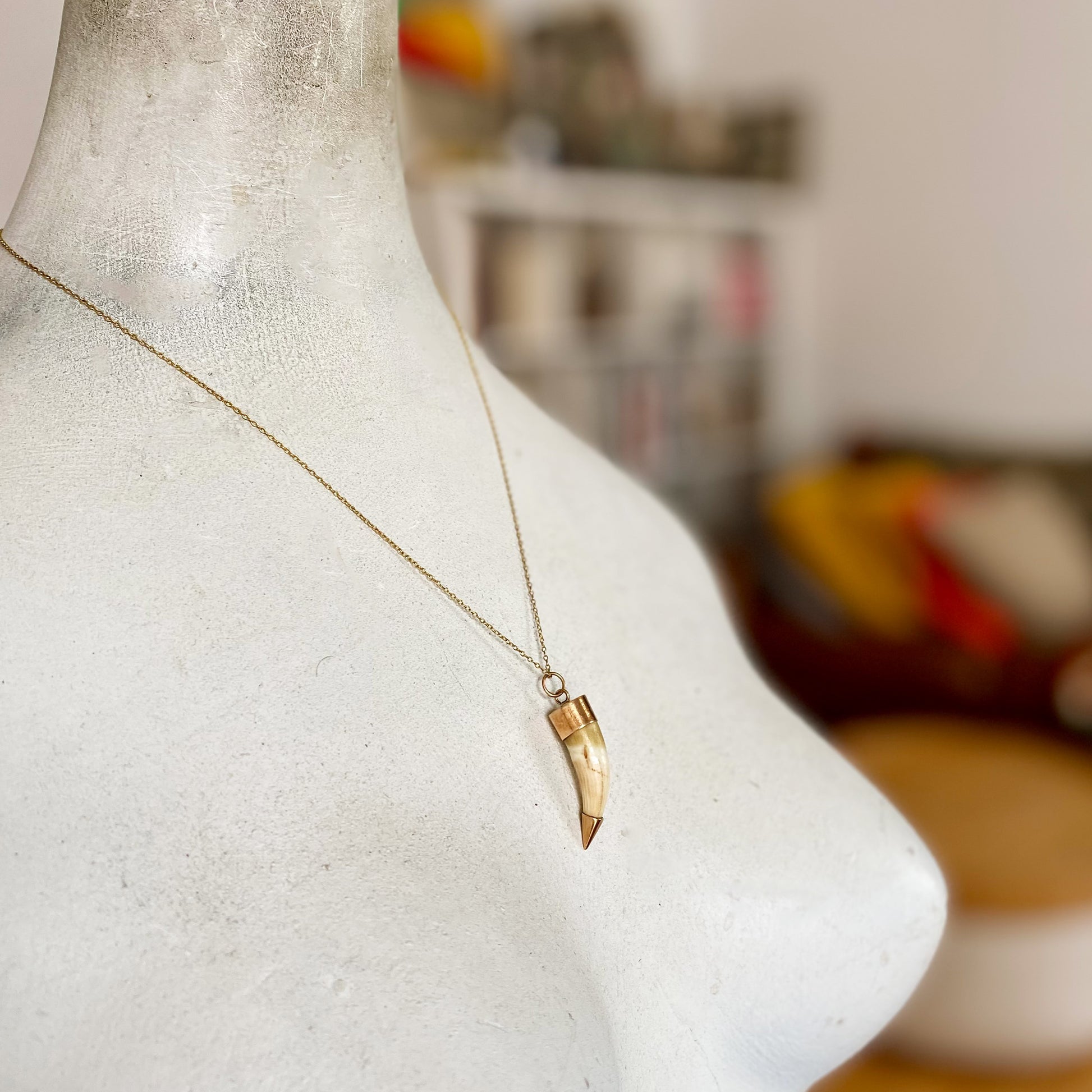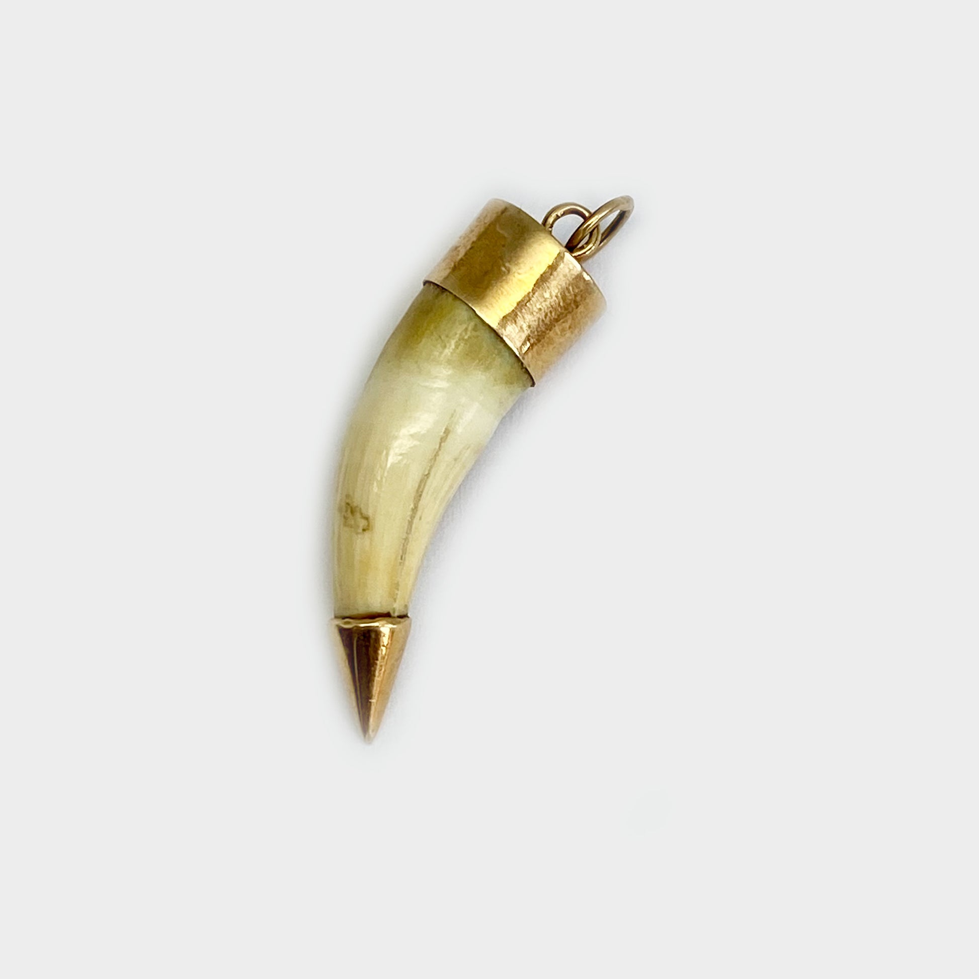 This antique animal fang is mounted on a solid 14k gold together with a pointy 14k gold cap on its end. (no hallmark but acid tested positive as 14k gold).