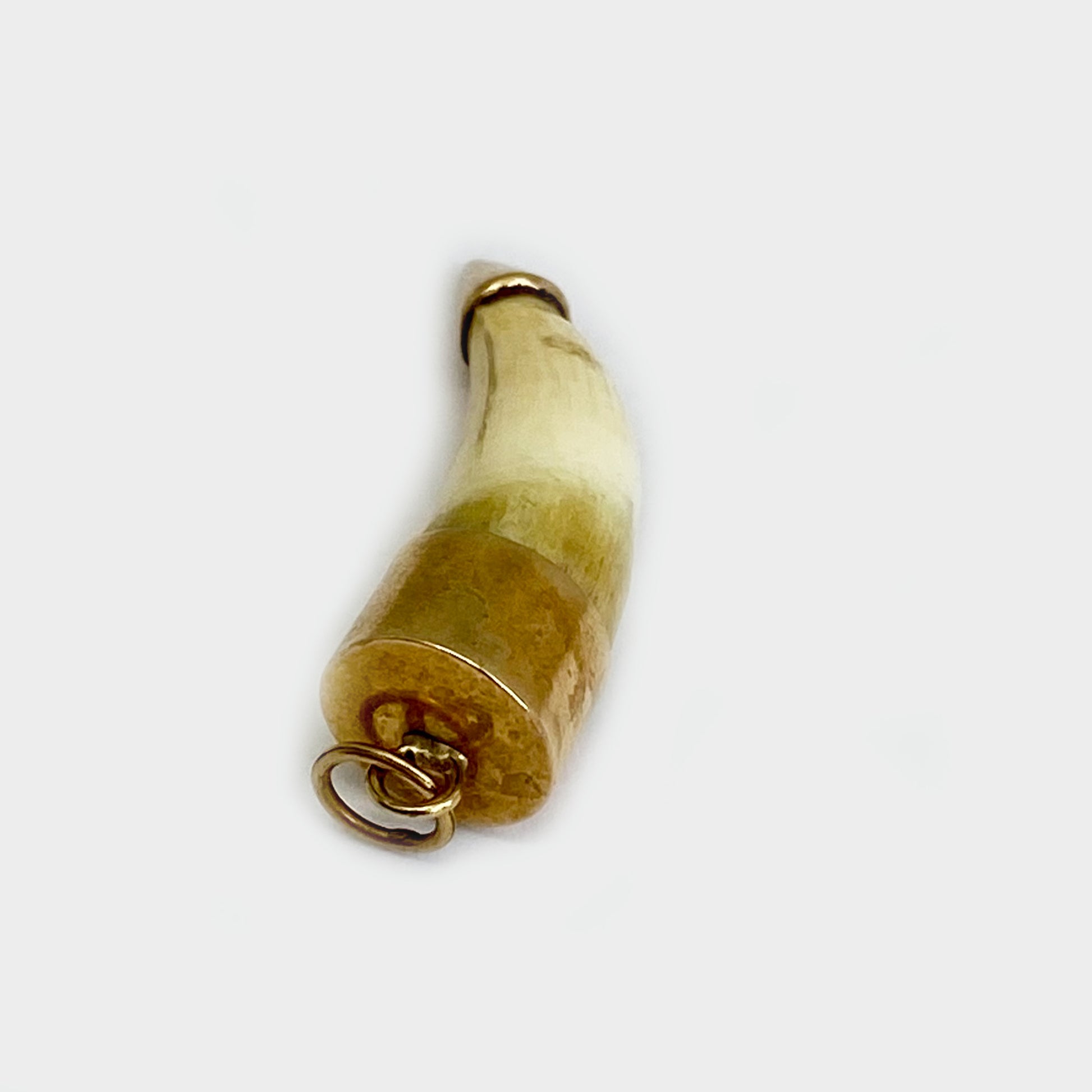A late 19th century tooth amulet charm pendant mounted on a 14k gold base.