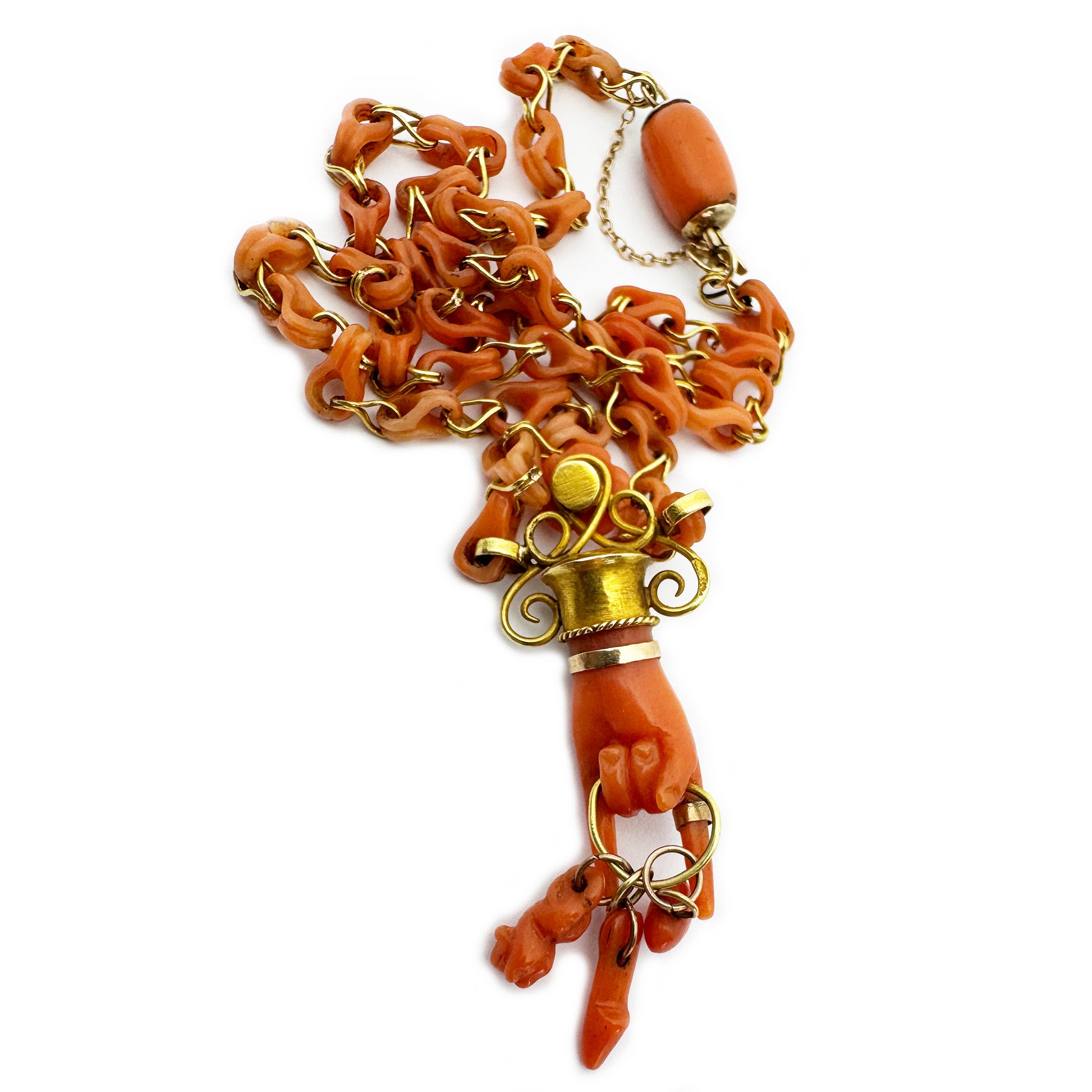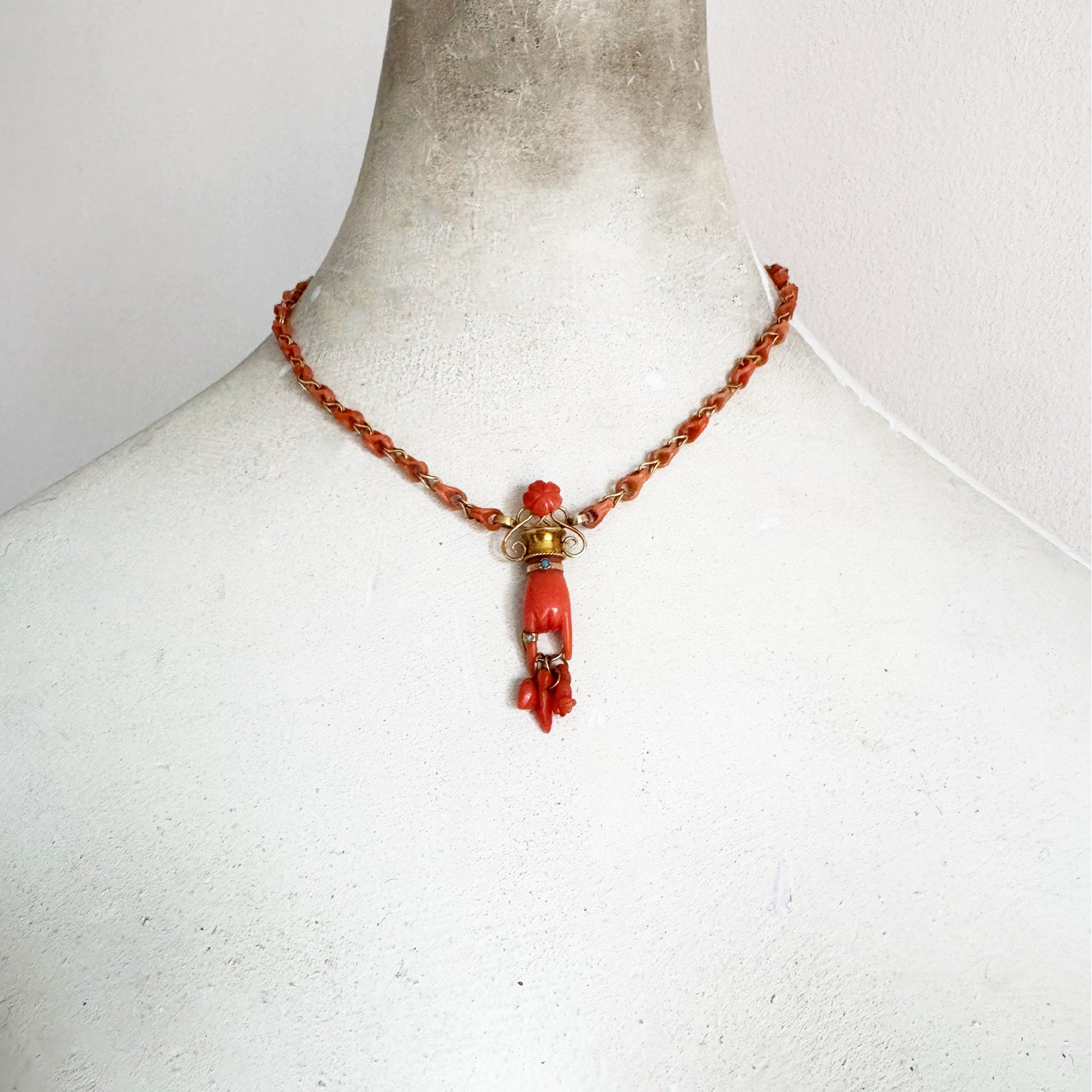 An exceptionally rare and symbolic piece of antique Italian jewellery, this mid 19th-century natural Coral and 14k gold necklace showcases a striking Mano Cornuta (Horned Hand) pendant, a traditional protective amulet against the evil eye.
