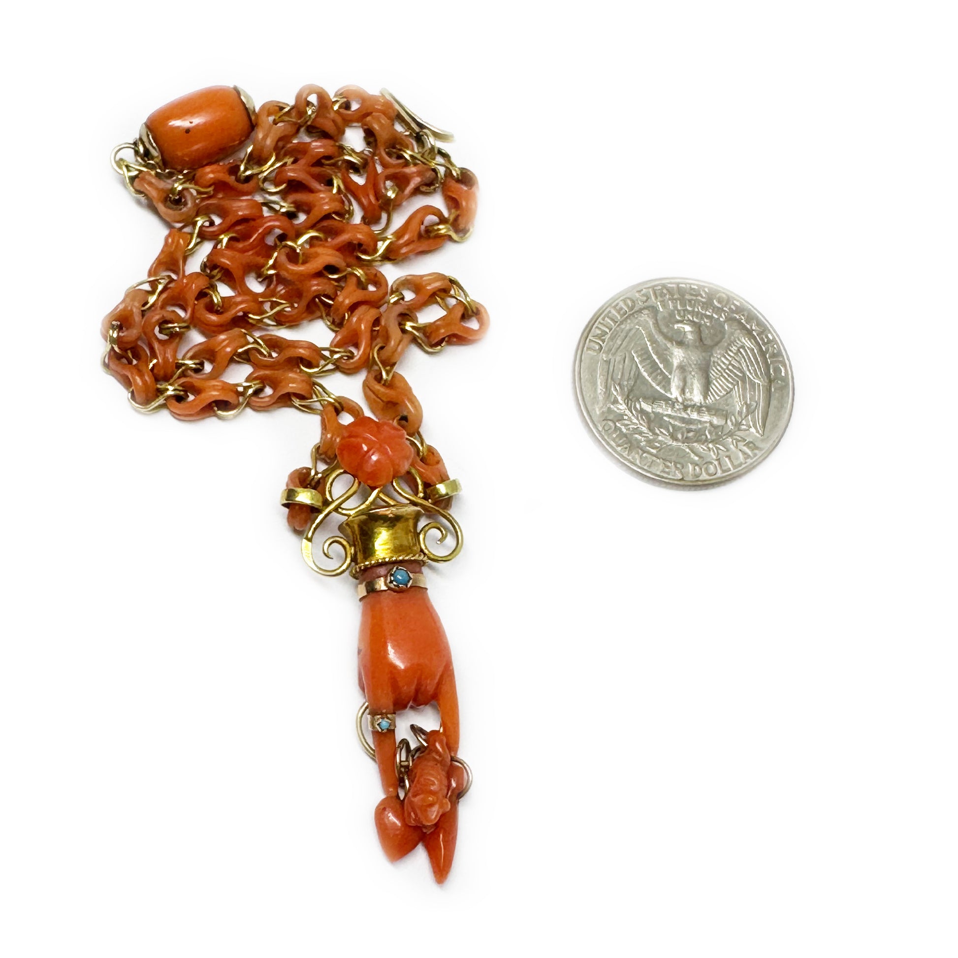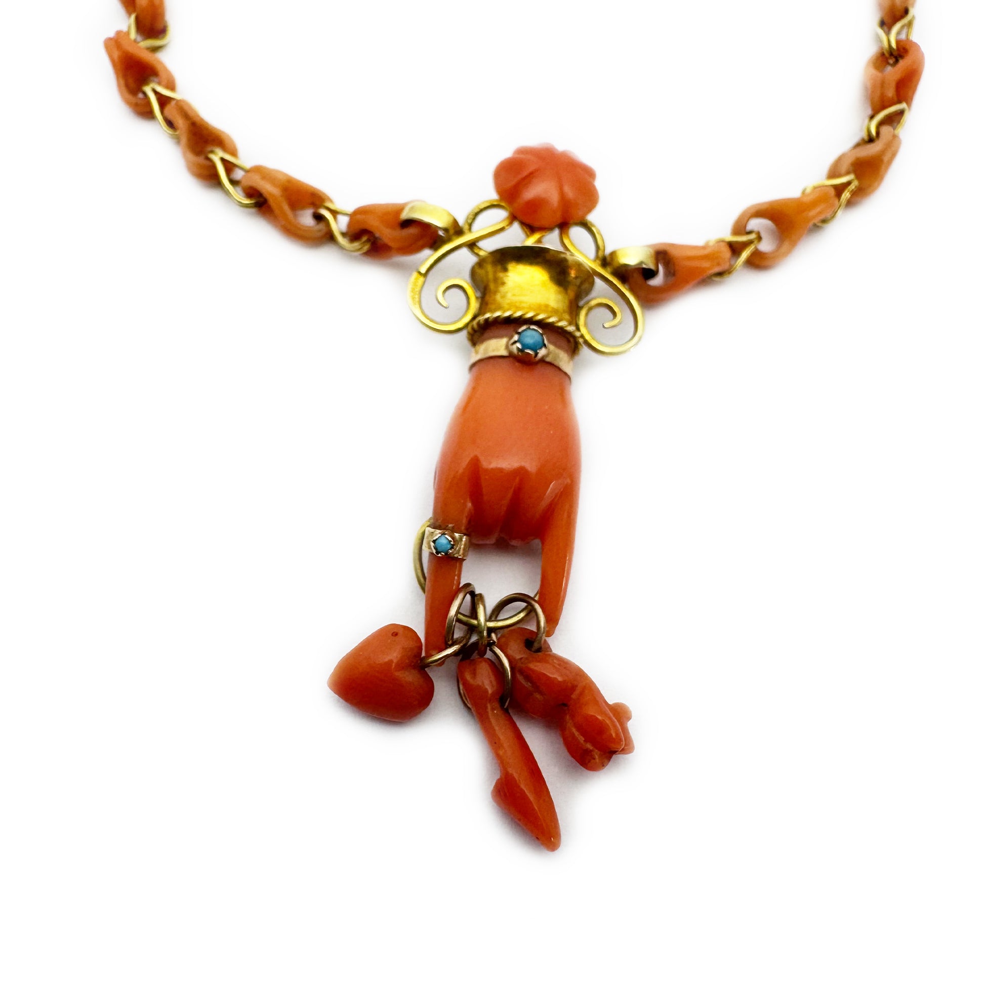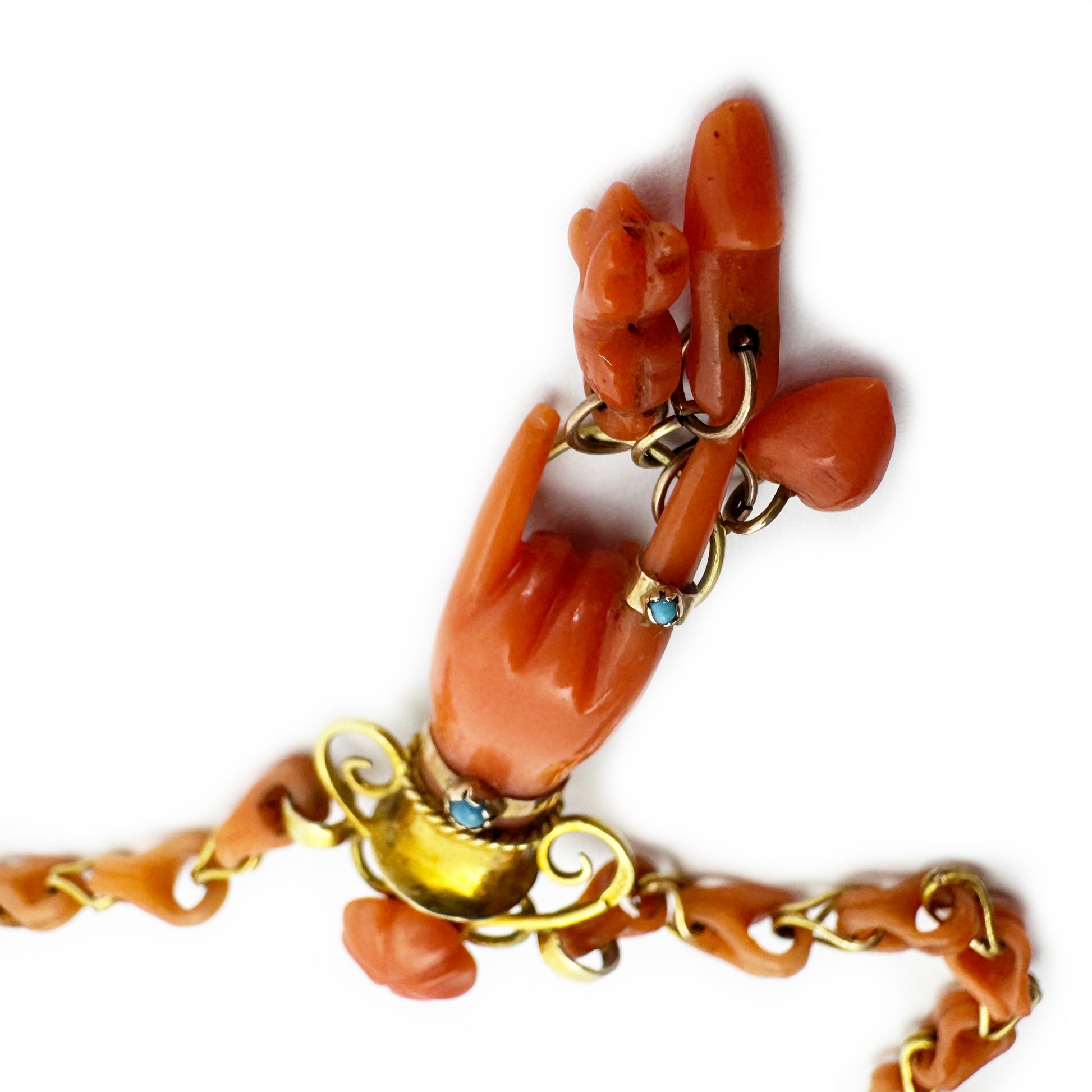 Expertly carved from natural Mediterranean coral, the pendant is mounted in rich 14k yellow gold, adorned with turquoise-set accents, and suspended from a beautifully linked Etruscan Revival gold and coral chain. A carved floral coral motif crowns the hand, while small hearts and symbols dangle from its base, adding movement and layered meaning.