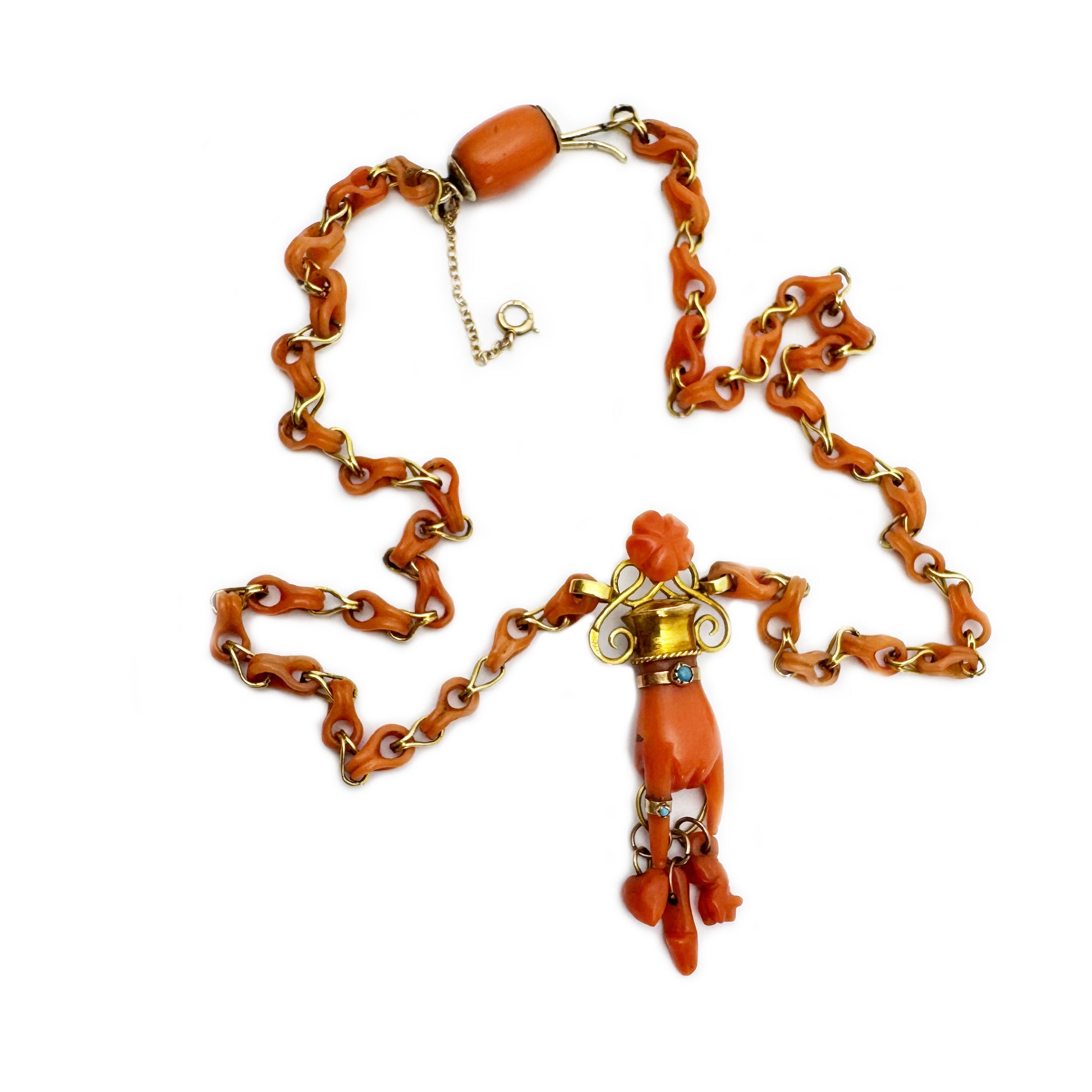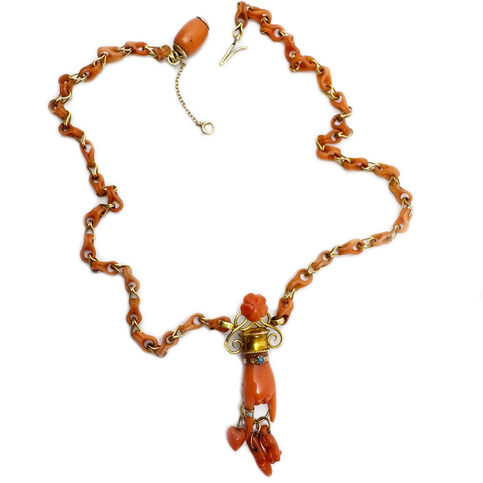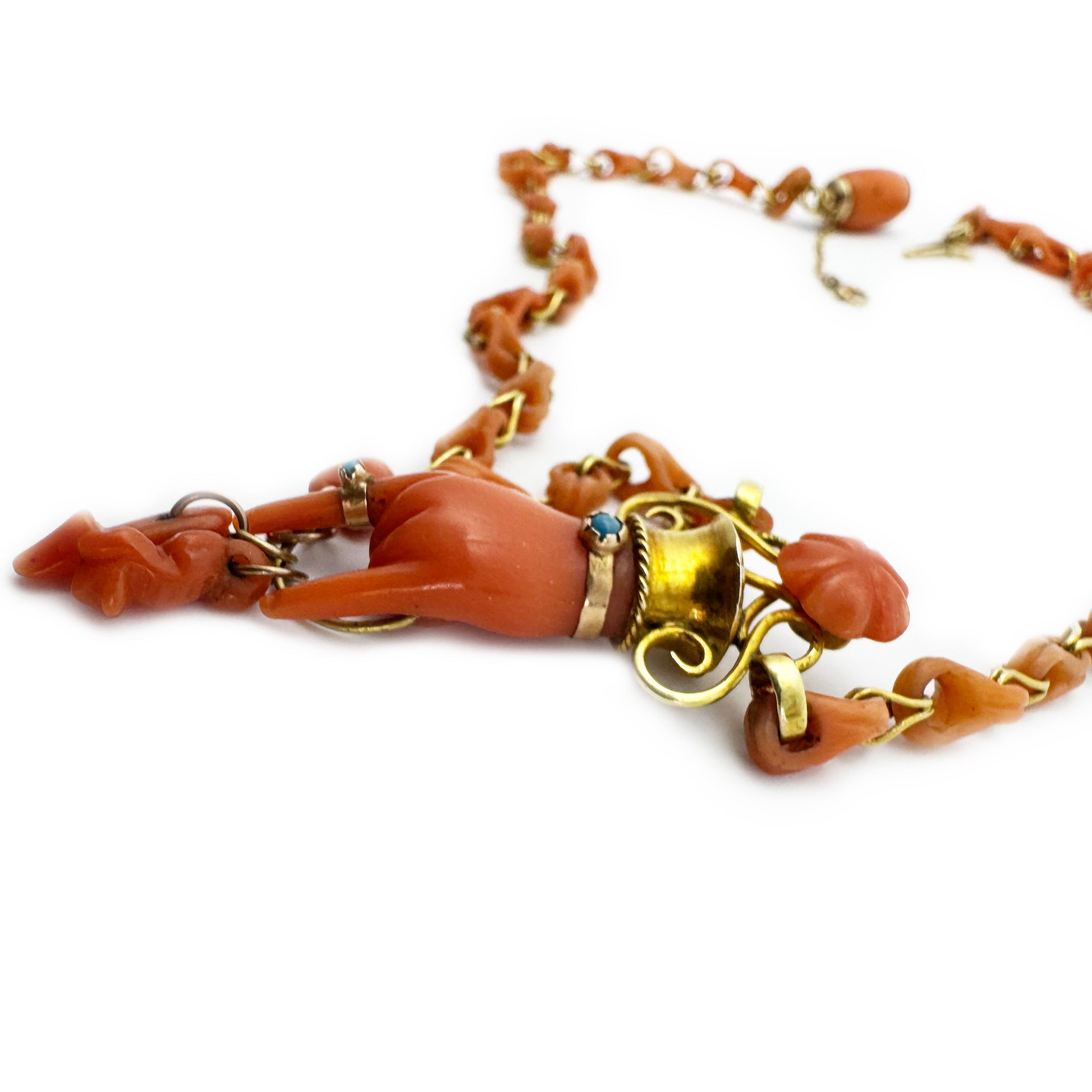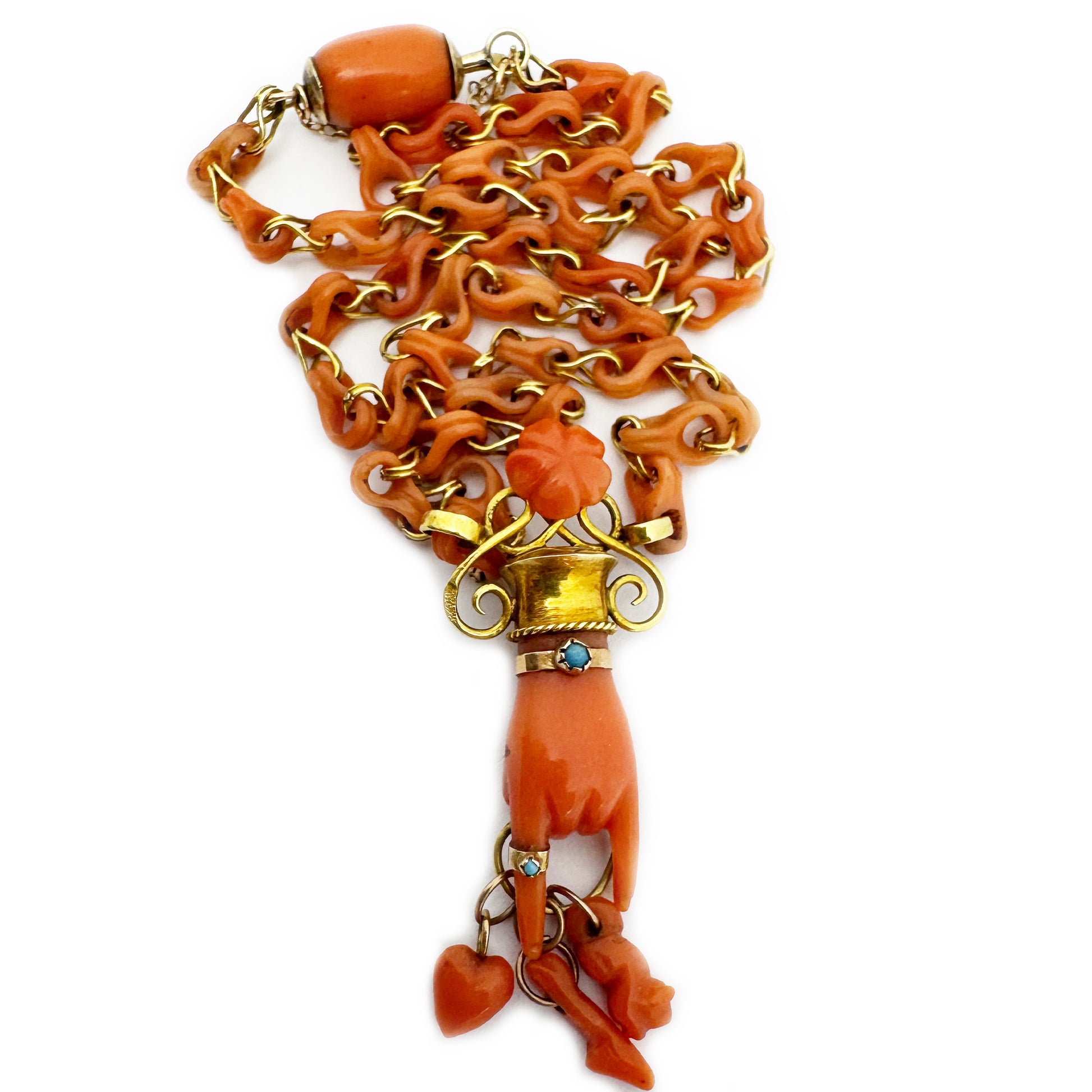 Expertly carved from natural Mediterranean coral, the pendant is mounted in rich 14k yellow gold, adorned with turquoise-set accents, and suspended from a beautifully linked Etruscan Revival gold and coral chain. A carved floral coral motif crowns the hand, while small hearts and symbols dangle from its base, adding movement and layered meaning.
