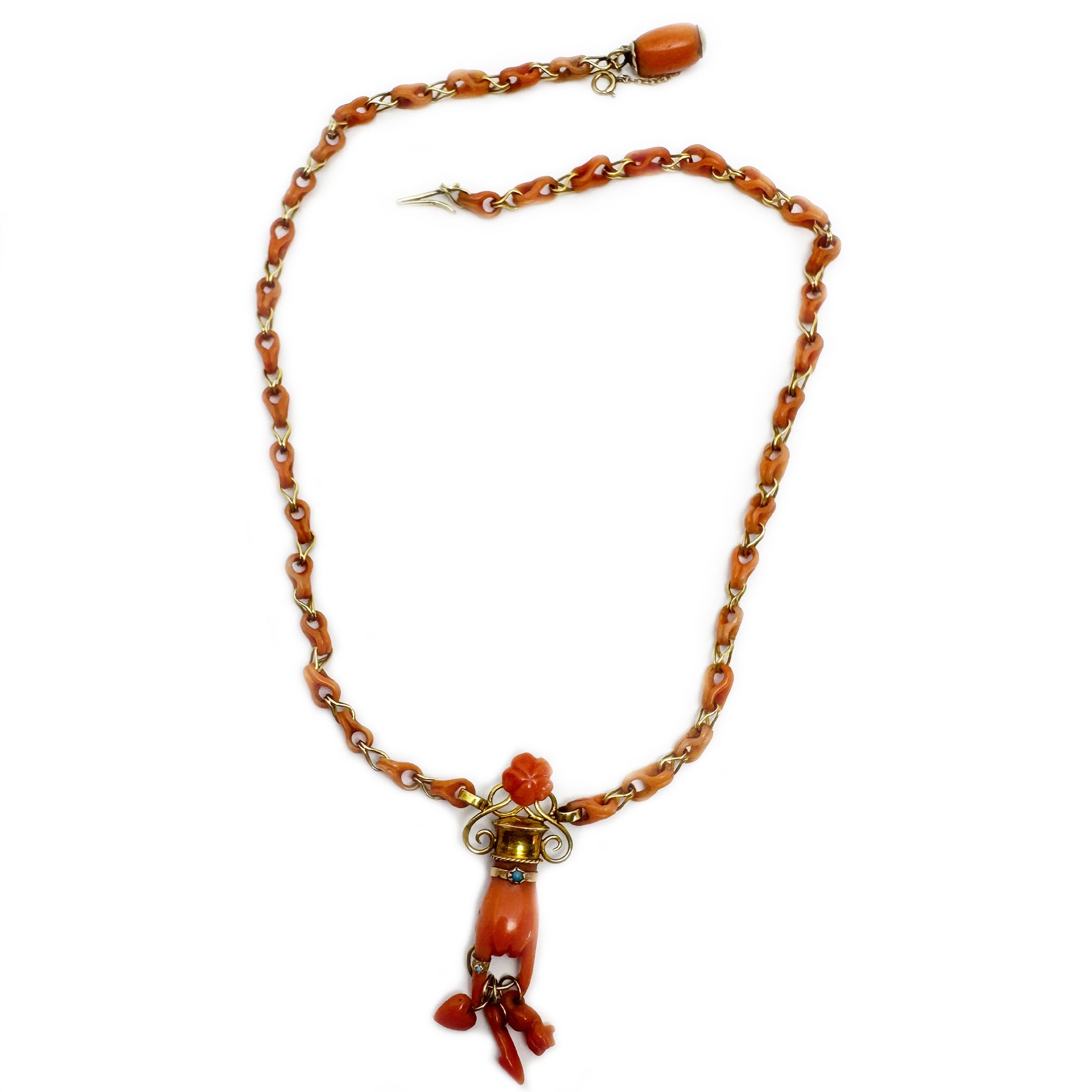 Antique 14k Gold Coral Figa Necklace, Mano Cornuta Amulet, Etruscan Revival Gold Chain, Lucky Horned Hand Pendant, Rare Victorian Choker