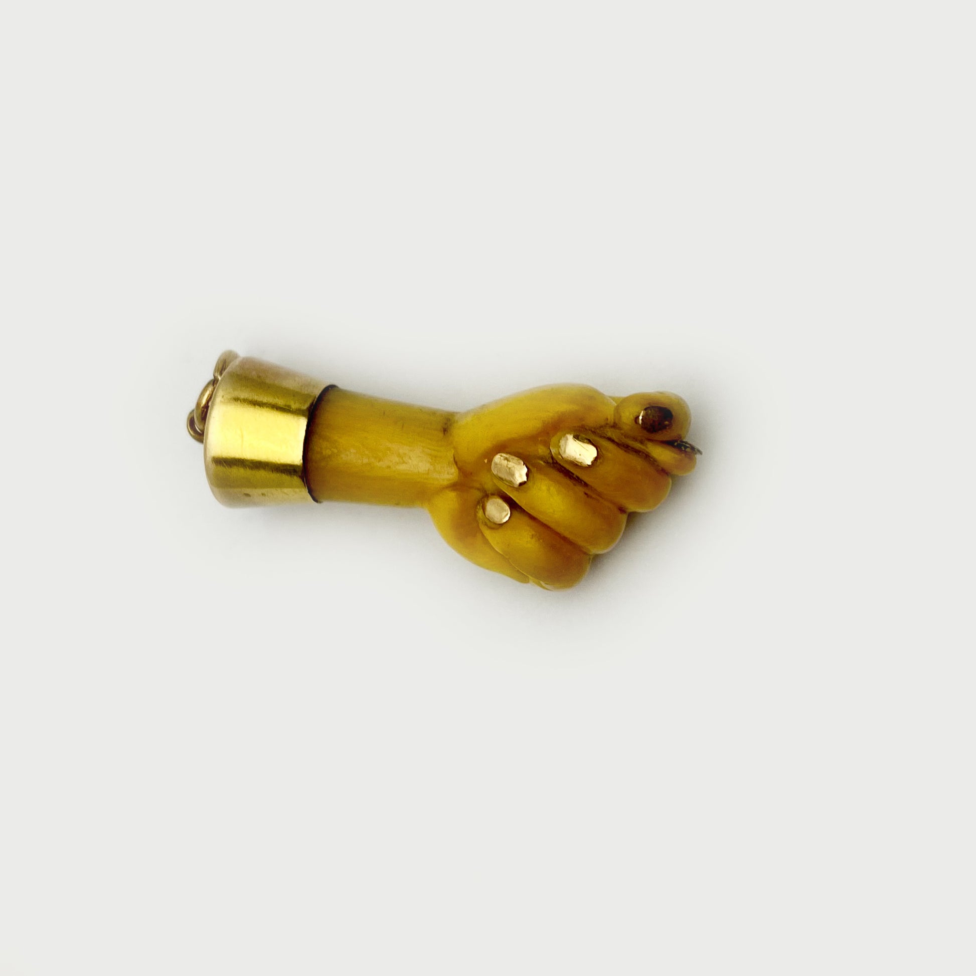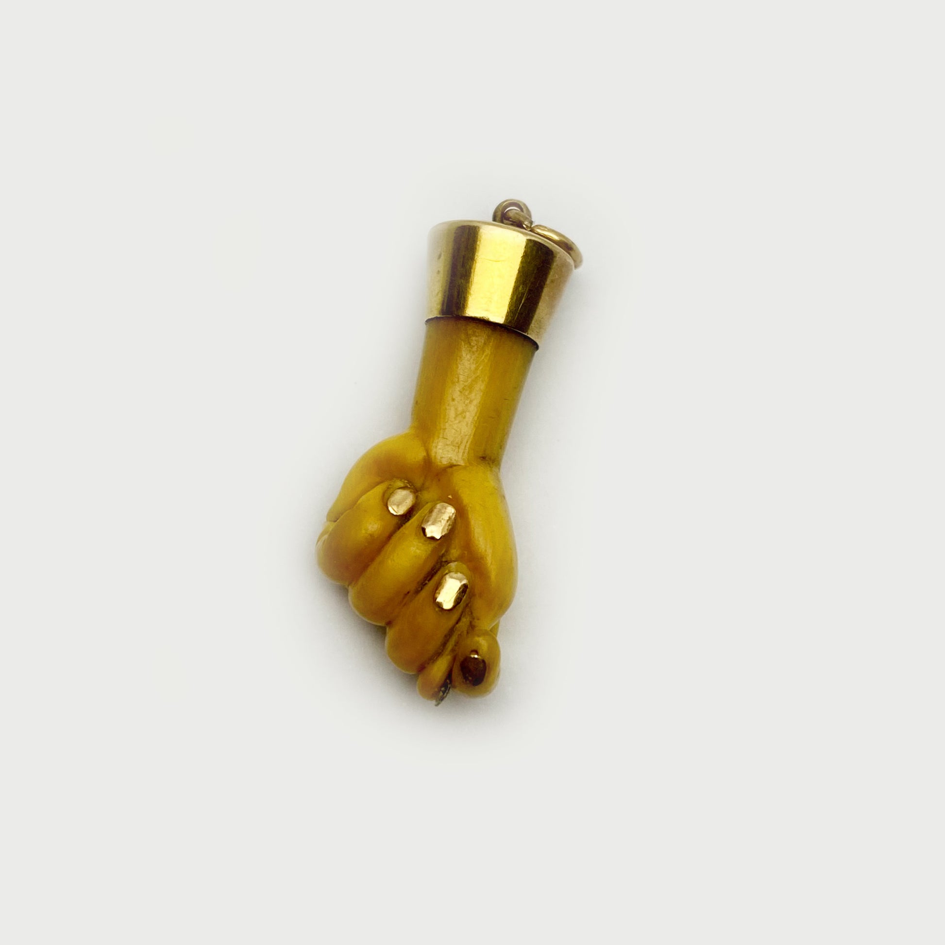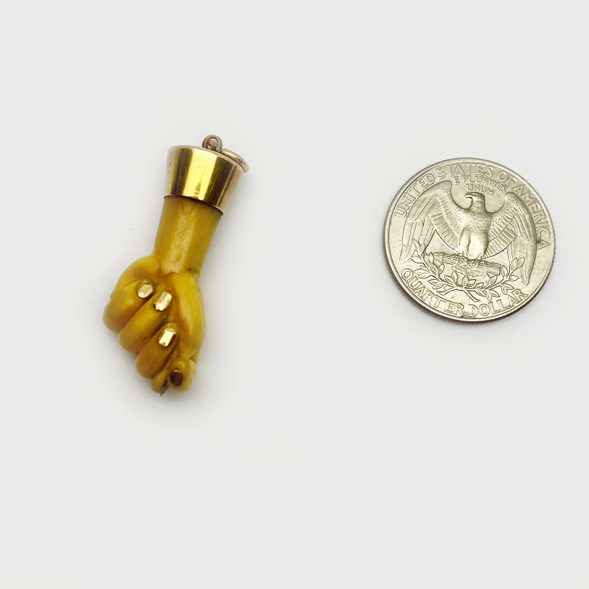 Delightful Mid Century fist pendant made of Bakelite/Celluloid, mounted on a 14k gold case with 14k gold nails - no hallmark - acid tested positive as 14k gold.