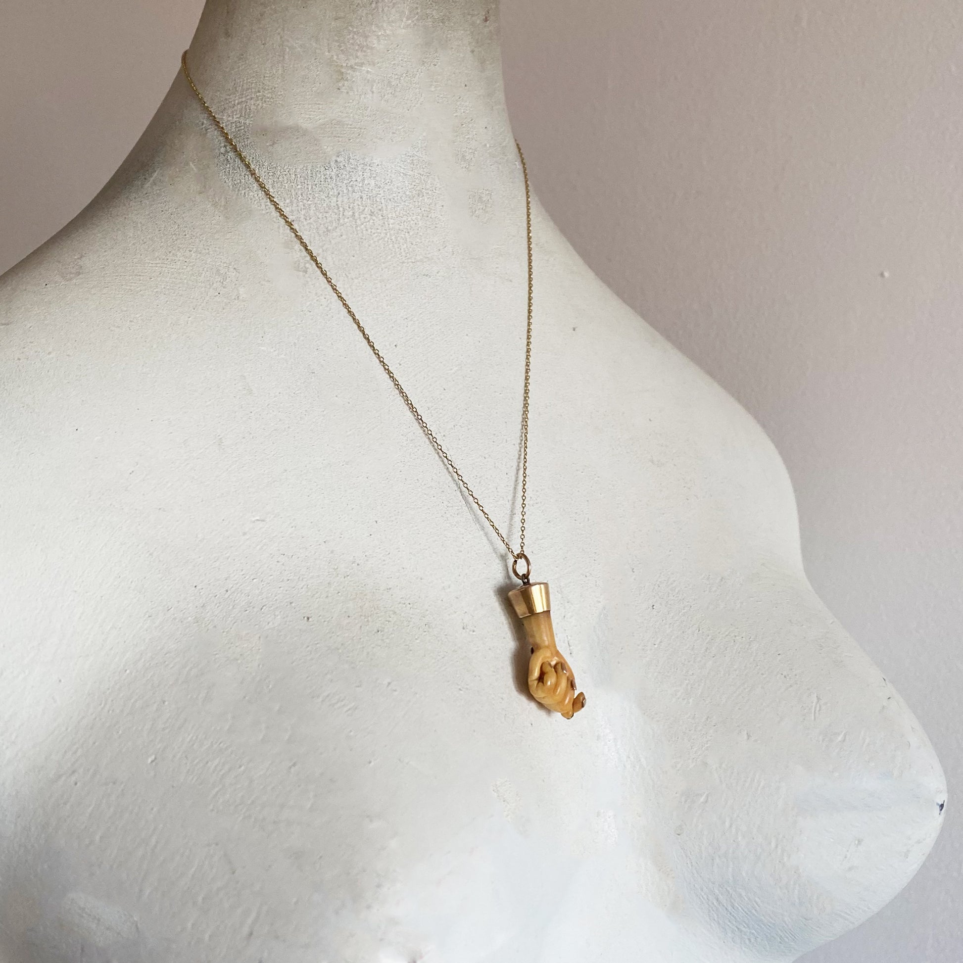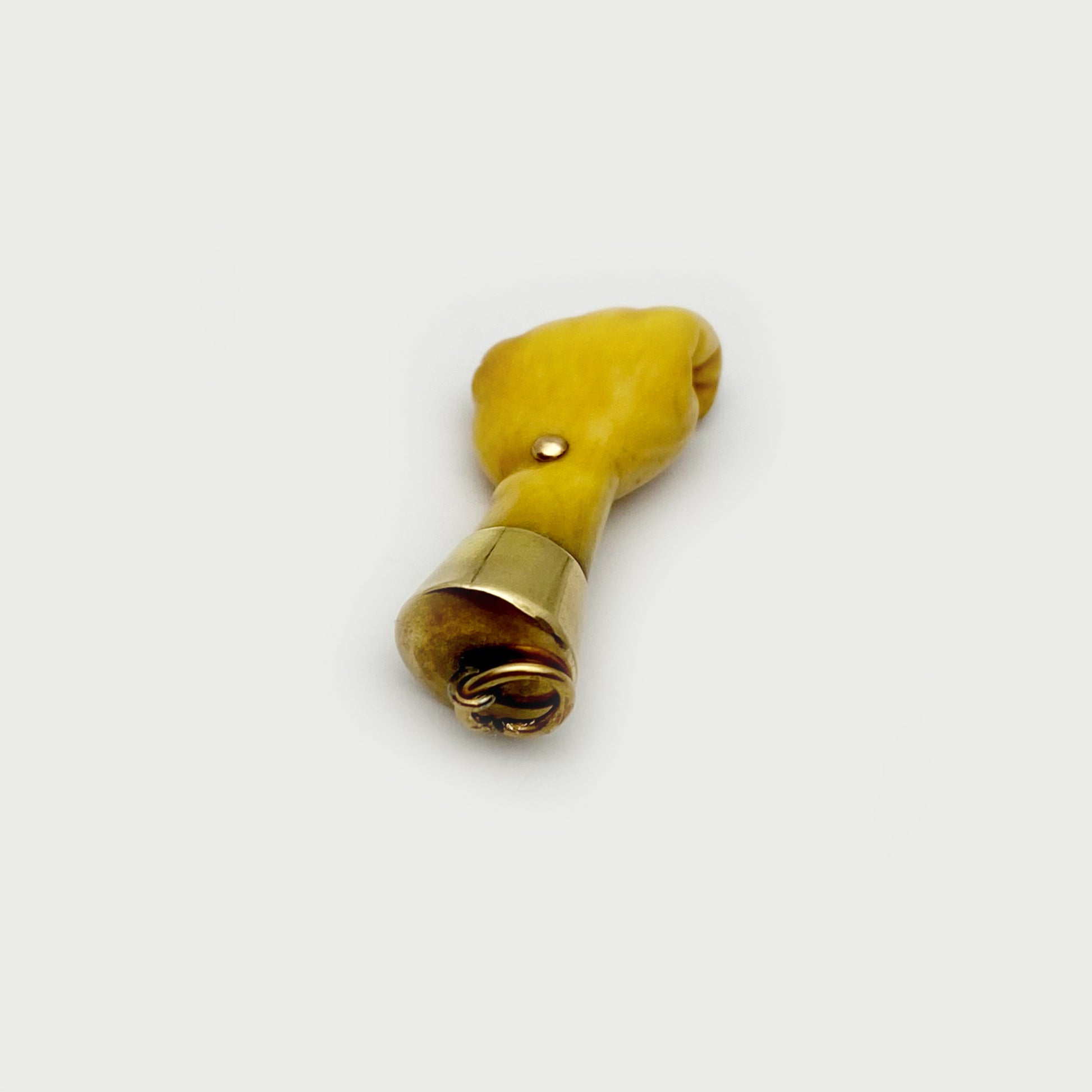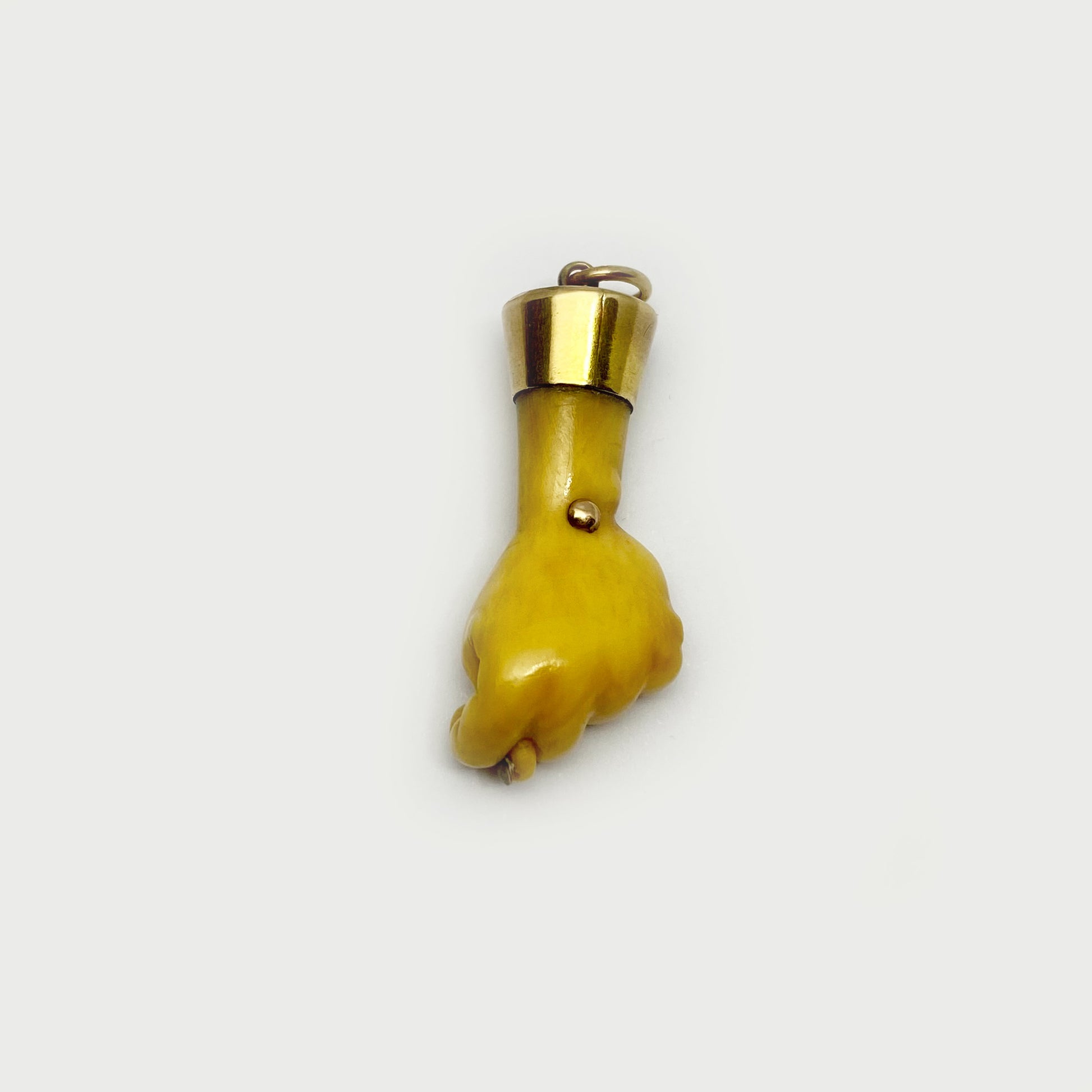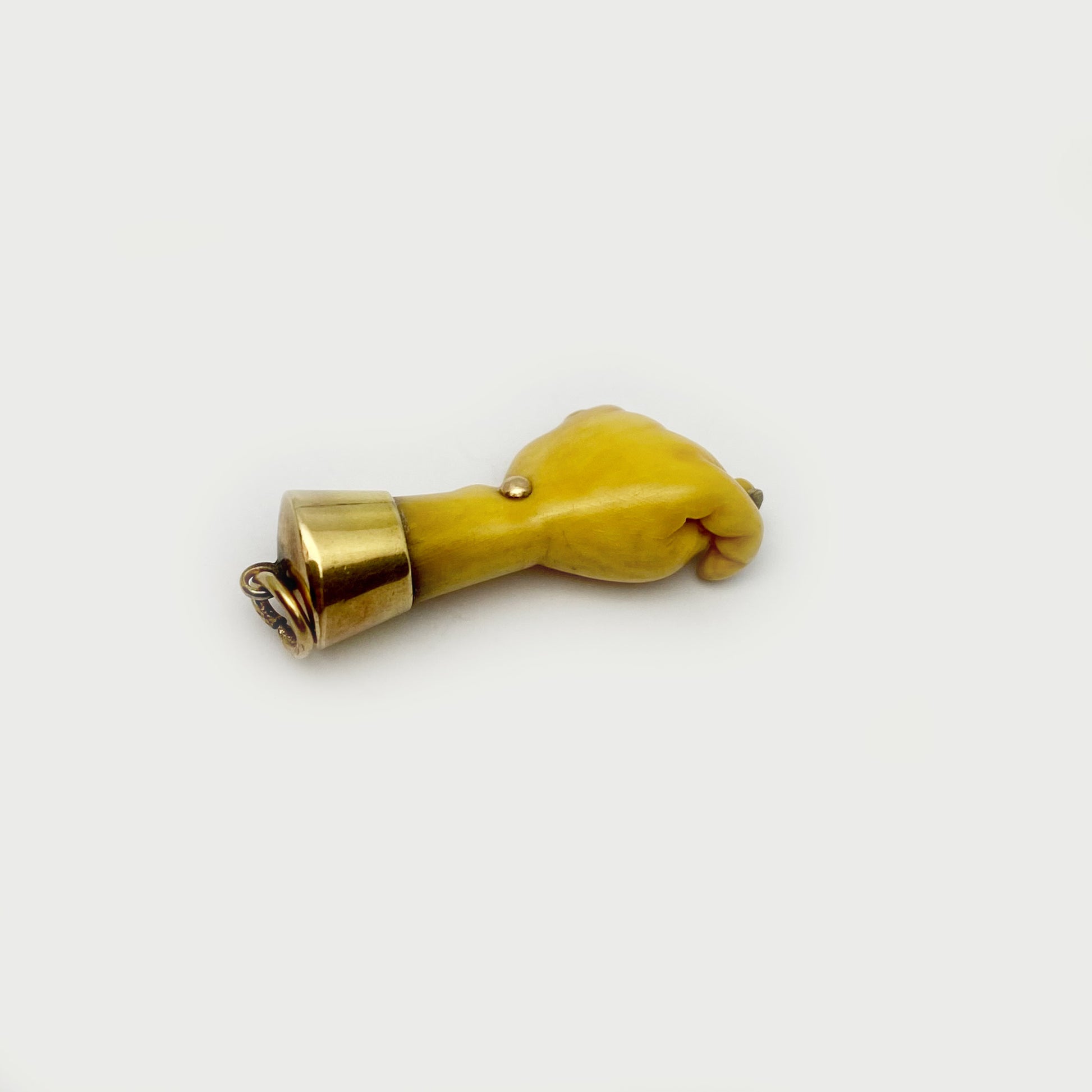 Delightful Mid Century fist pendant made of Bakelite/Celluloid, mounted on a 14k gold case with 14k gold nails - no hallmark - acid tested positive as 14k gold.