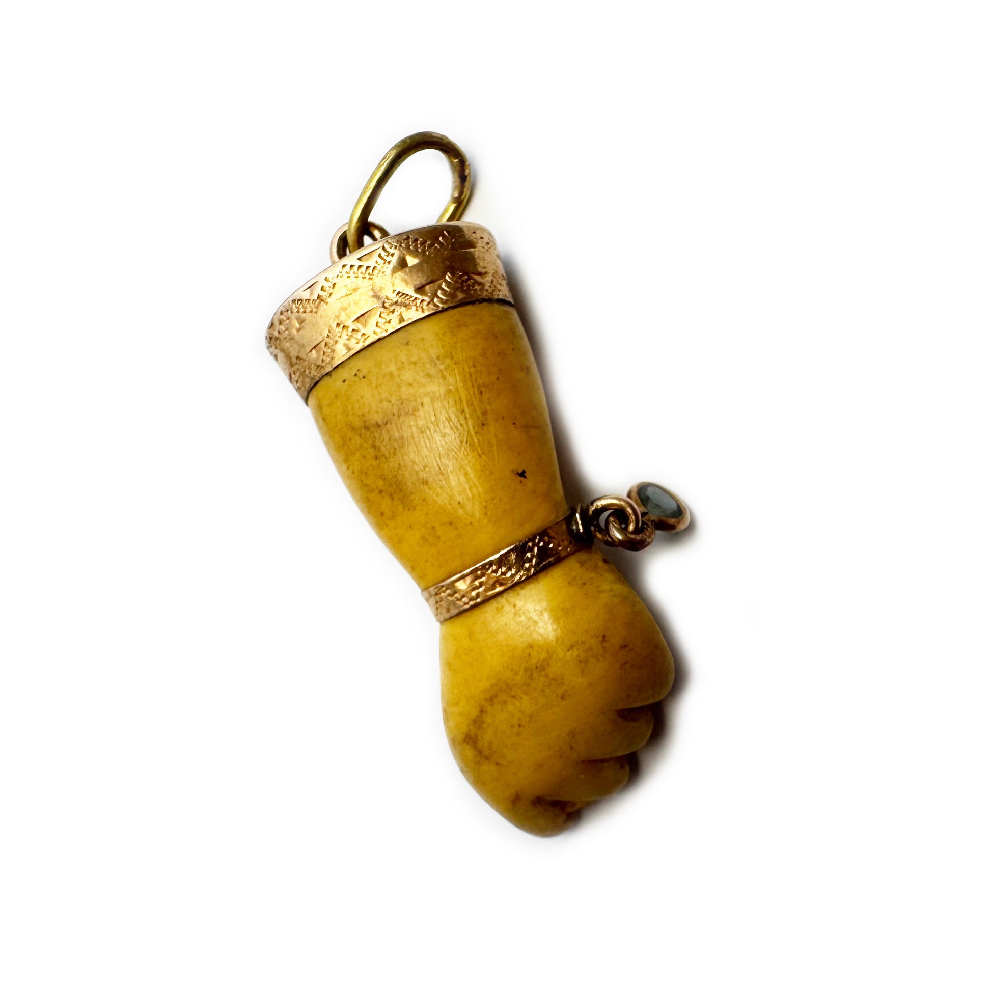 Exquisite Antique 14k Gold Figa Pendant, crafted from bone and set in a stunning embellished 14k gold case. It has four gold nails and a delicate 14k gold embellished bracelet with a tiny blue stone hanging from it.