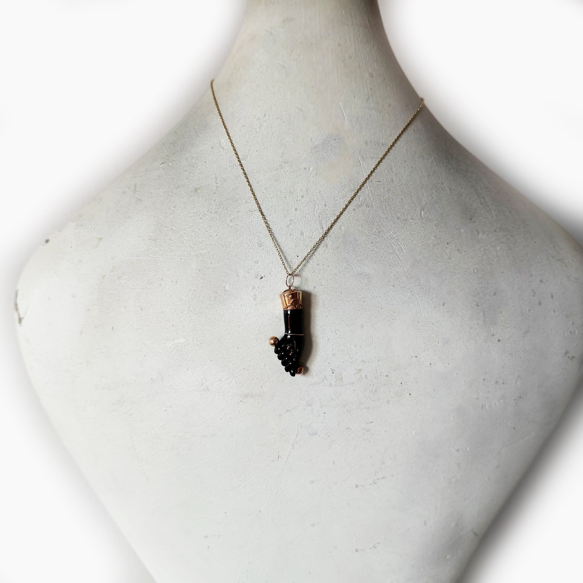 A striking and unusual antique hand pendant, carved from a deep black material most consistent with jet, and mounted in an ornate 14k solid gold setting.