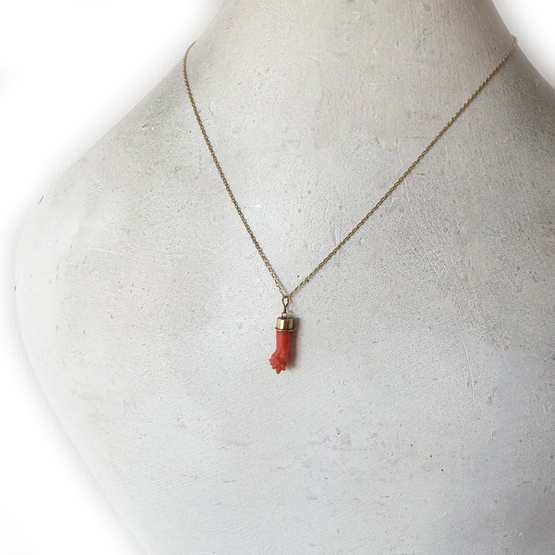 Dating to the late 19th century, this miniature Victorian hand is wonderfully expressive despite its small scale. The coral has that rich, warm orange tone only natural Mediterranean coral possesses, softly mellowed by time. The gold mount frames it neatly, giving the piece a refined yet talismanic character.