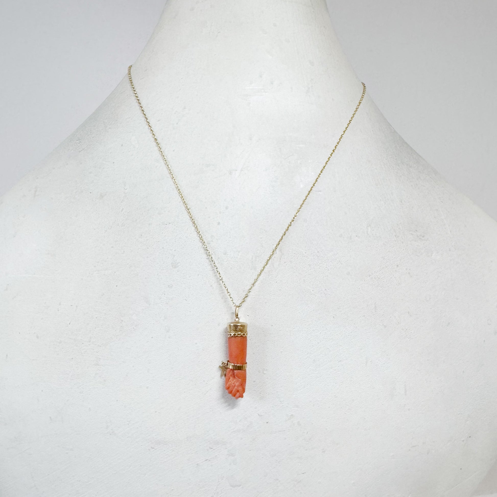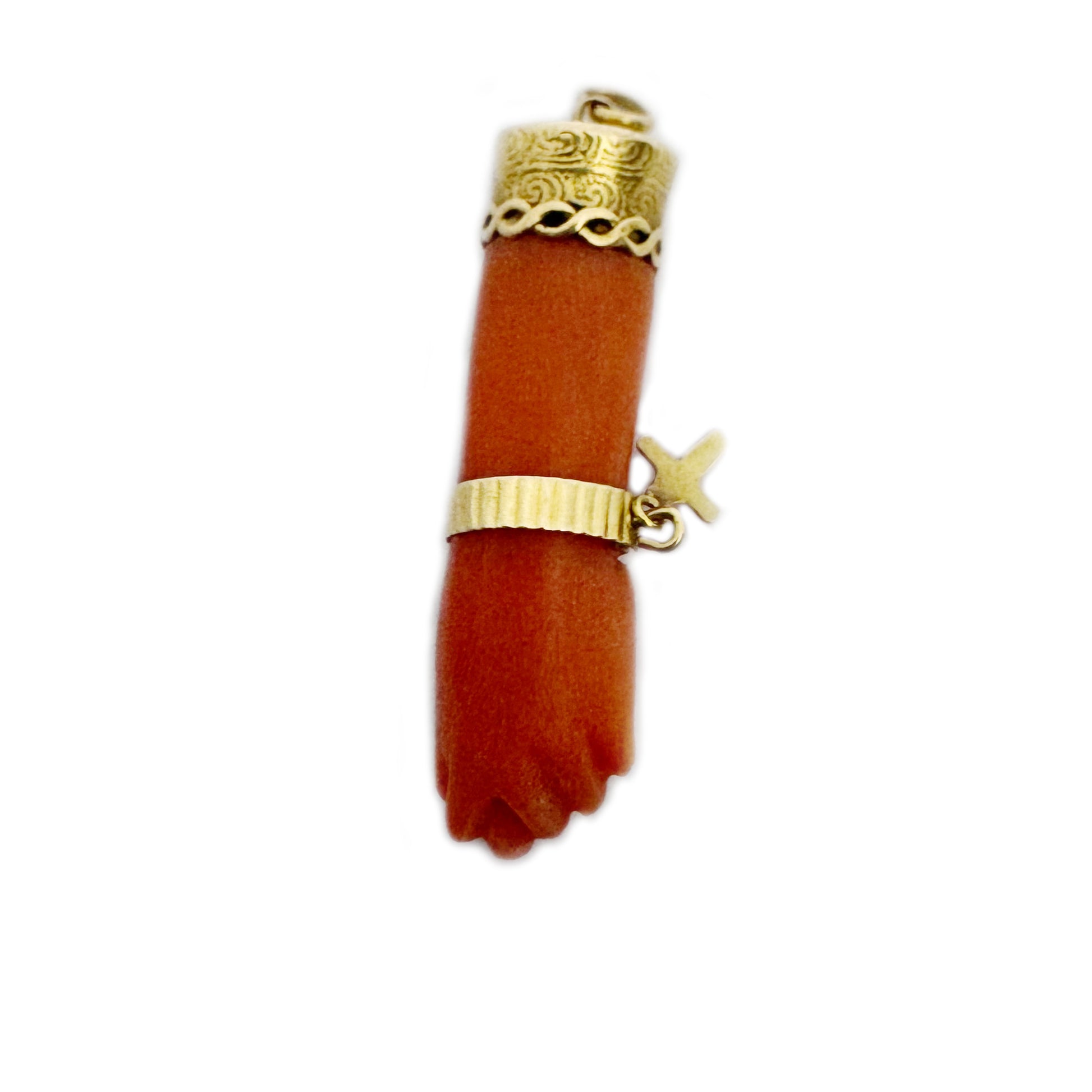 The hand, sculpted in the traditional fist form, symbolises protection and good fortune. It displays a rich salmon-orange hue typical of antique coral and is fitted with an engraved 18k gold cap and matching gold bangle, from which hangs a delicate miniature gold cross, a rare and meaningful detail.