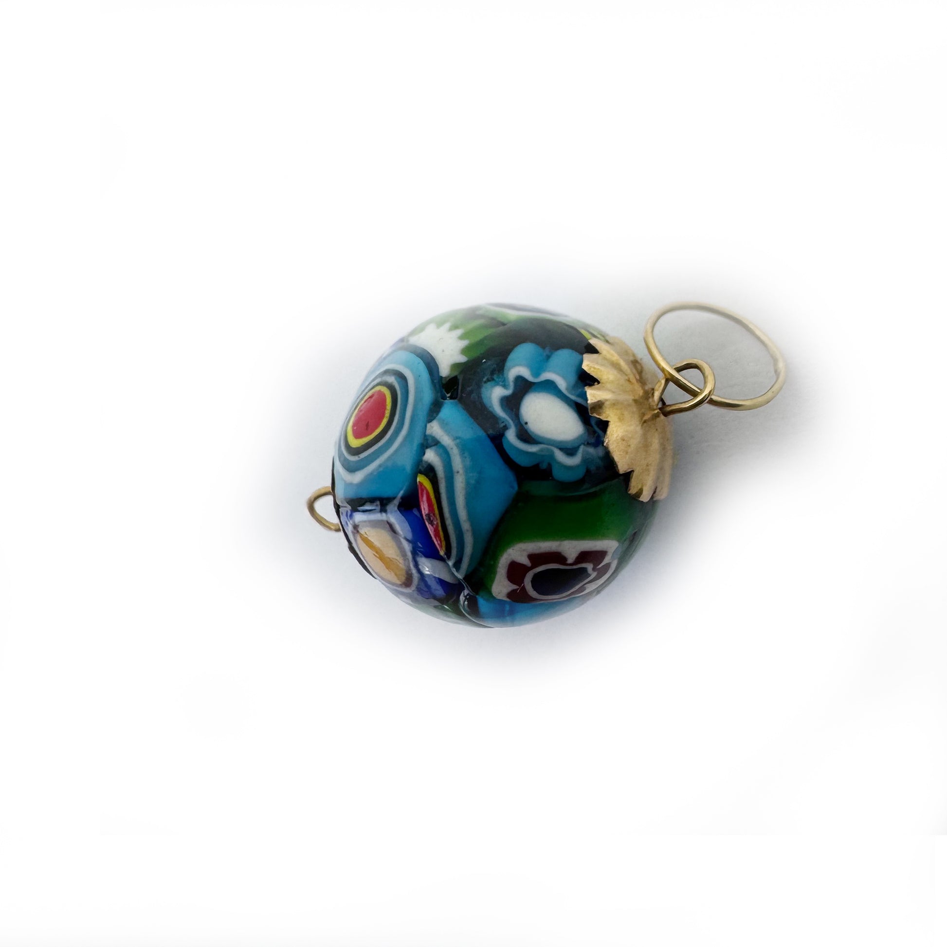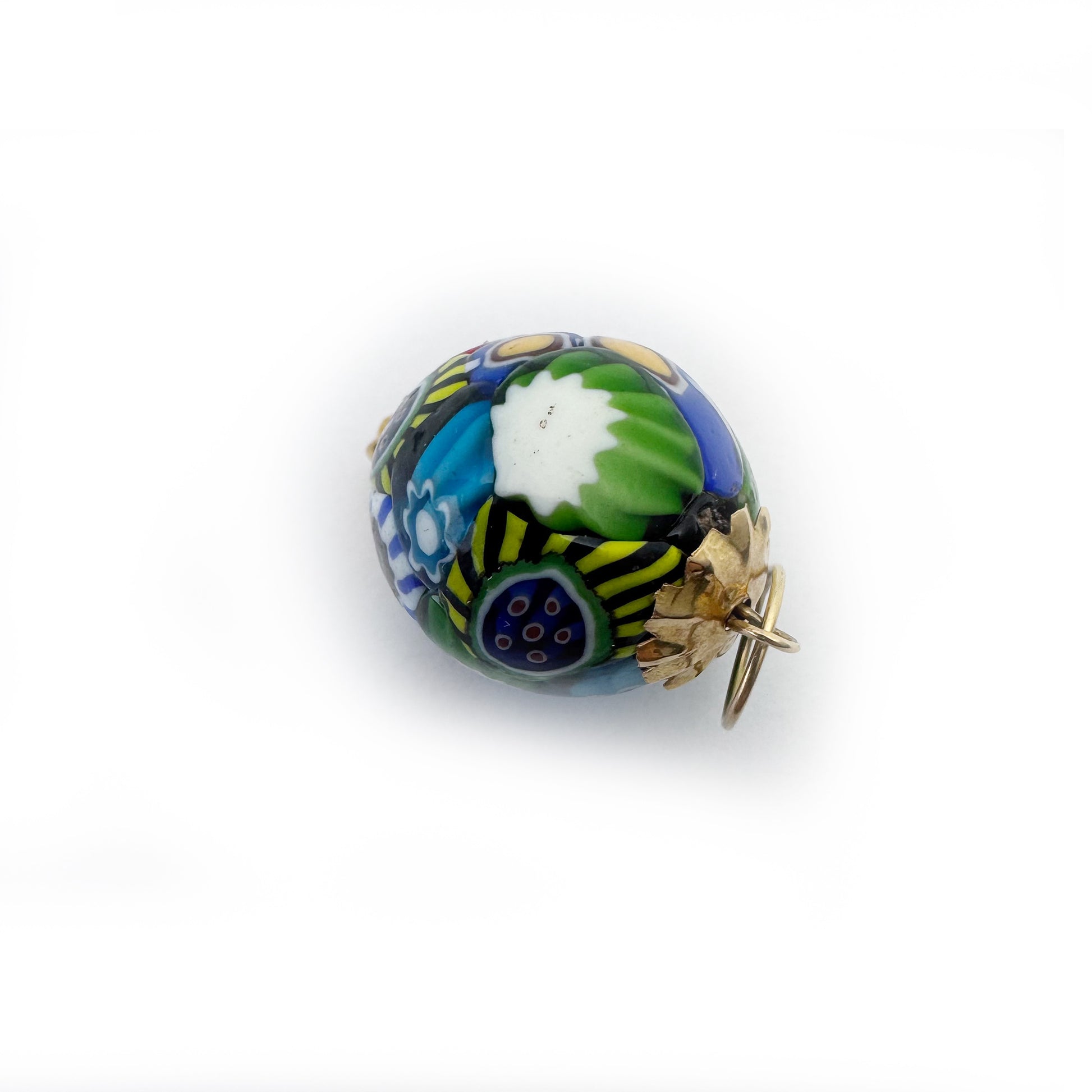 An exceptional antique charm pendant, crafted with a vibrant millefiori glass sphere and finished with solid 18k gold mounts.