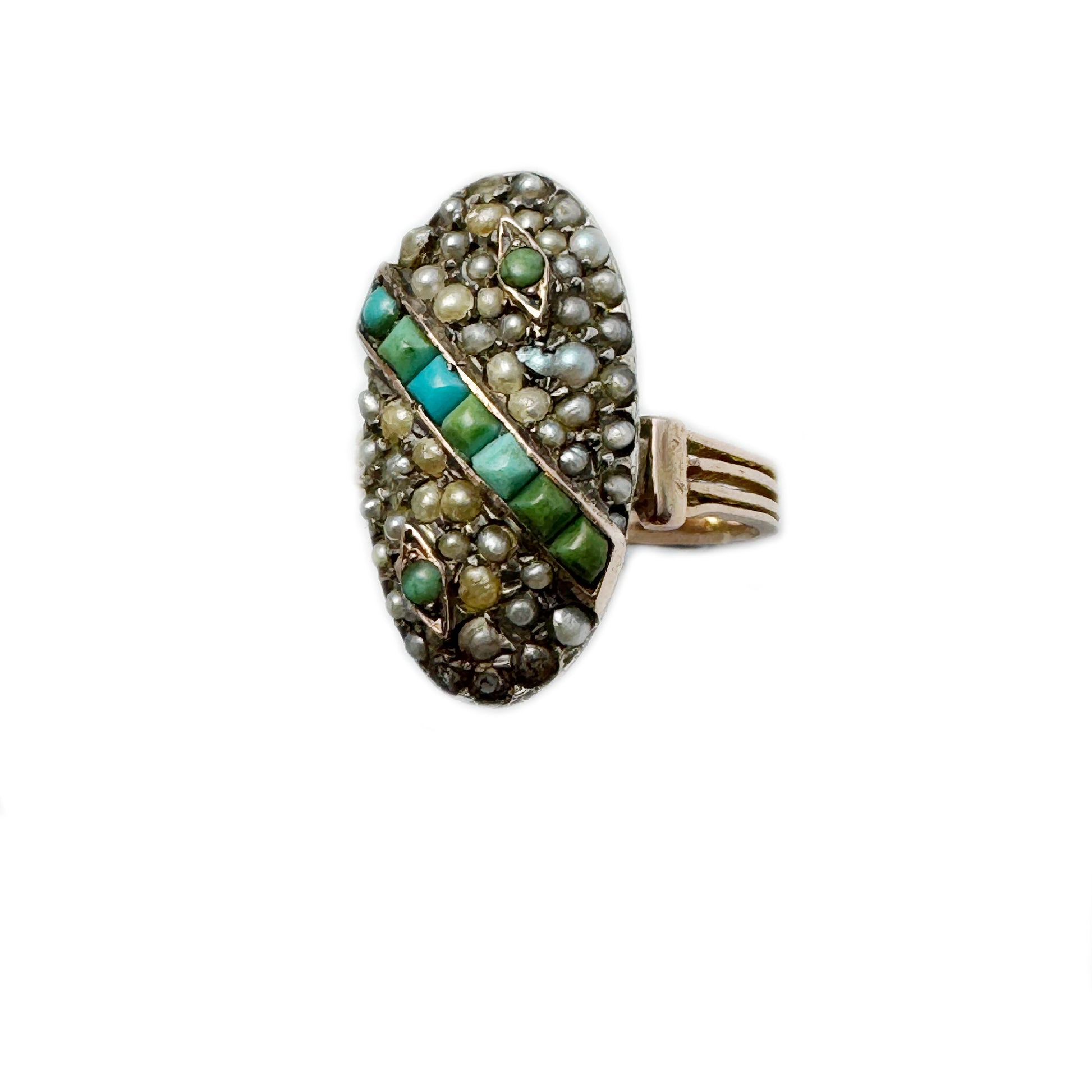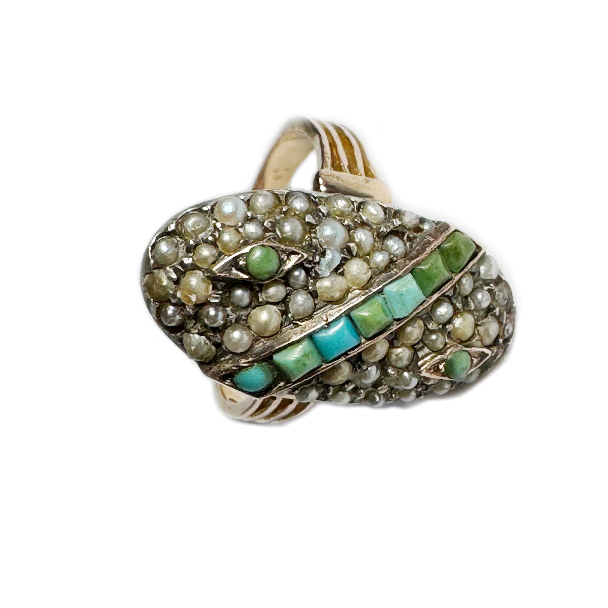 Antique 18K Gold Ring, Pearl & Turquoise Navette Ring, Uncleaned Victorian Era Jewellery , Size US 5 / UK J , 3.9 grams, 19th Century Ring