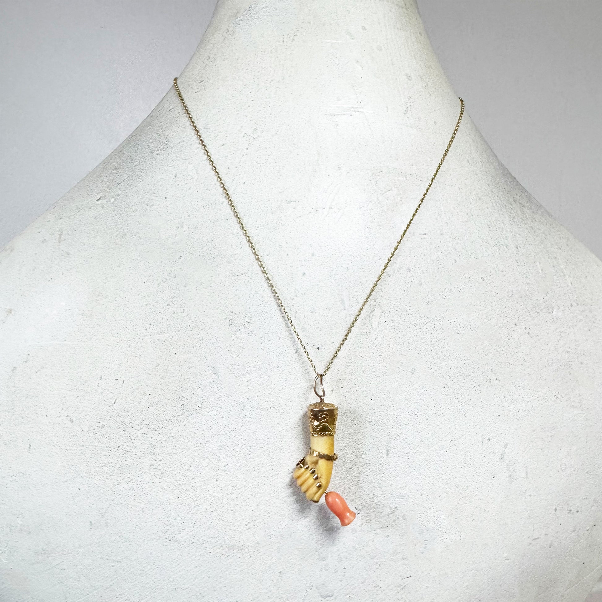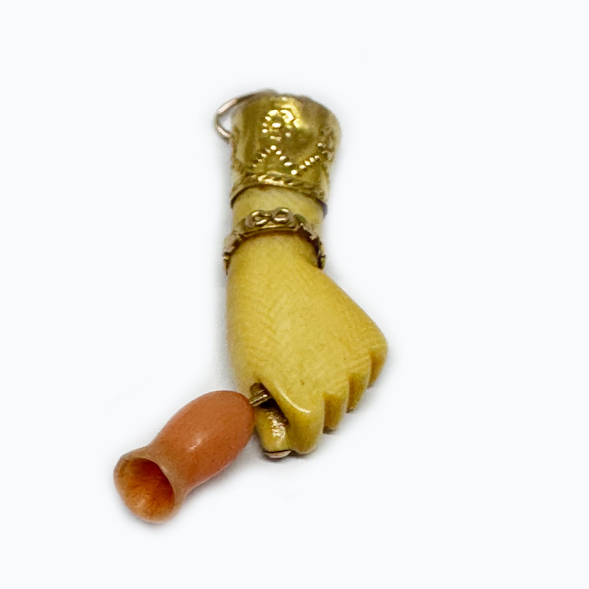 Antique 9k Gold Bone Figa Pendant, Victorian Coral Flower Amulet