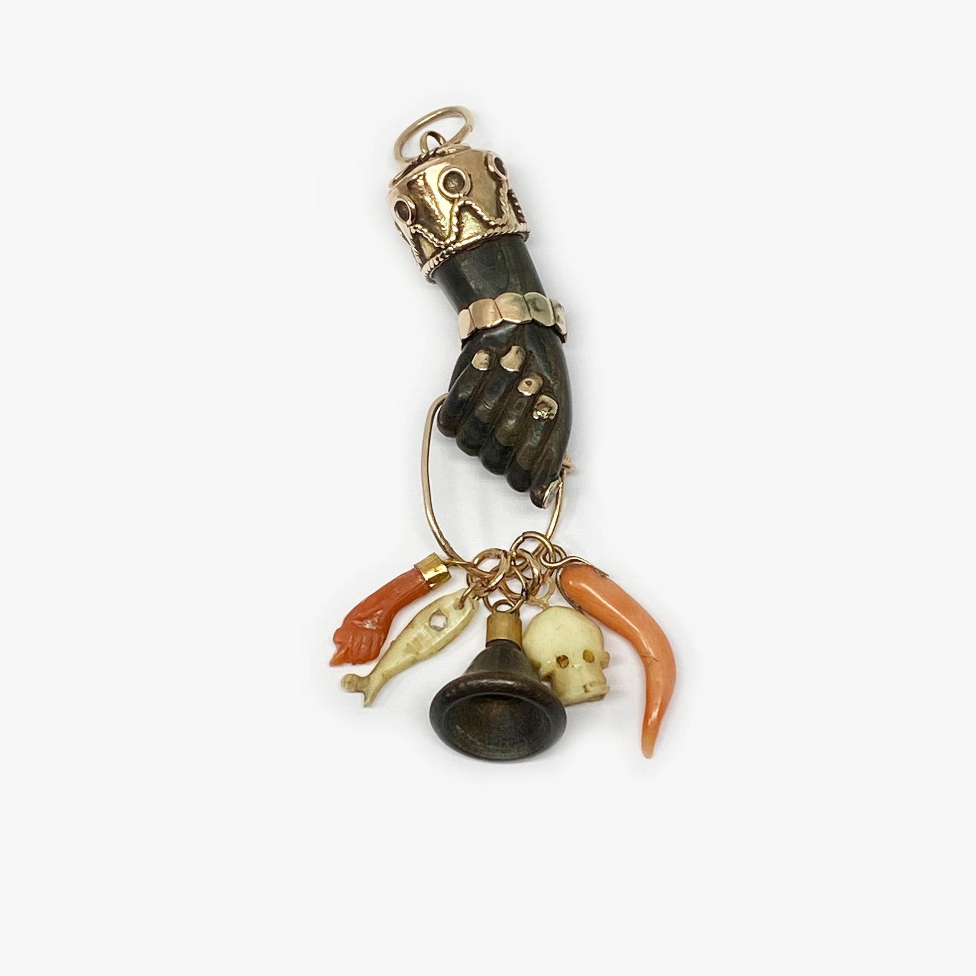 A very unique late Victorian fist pendant with delightful charms hanging from it.