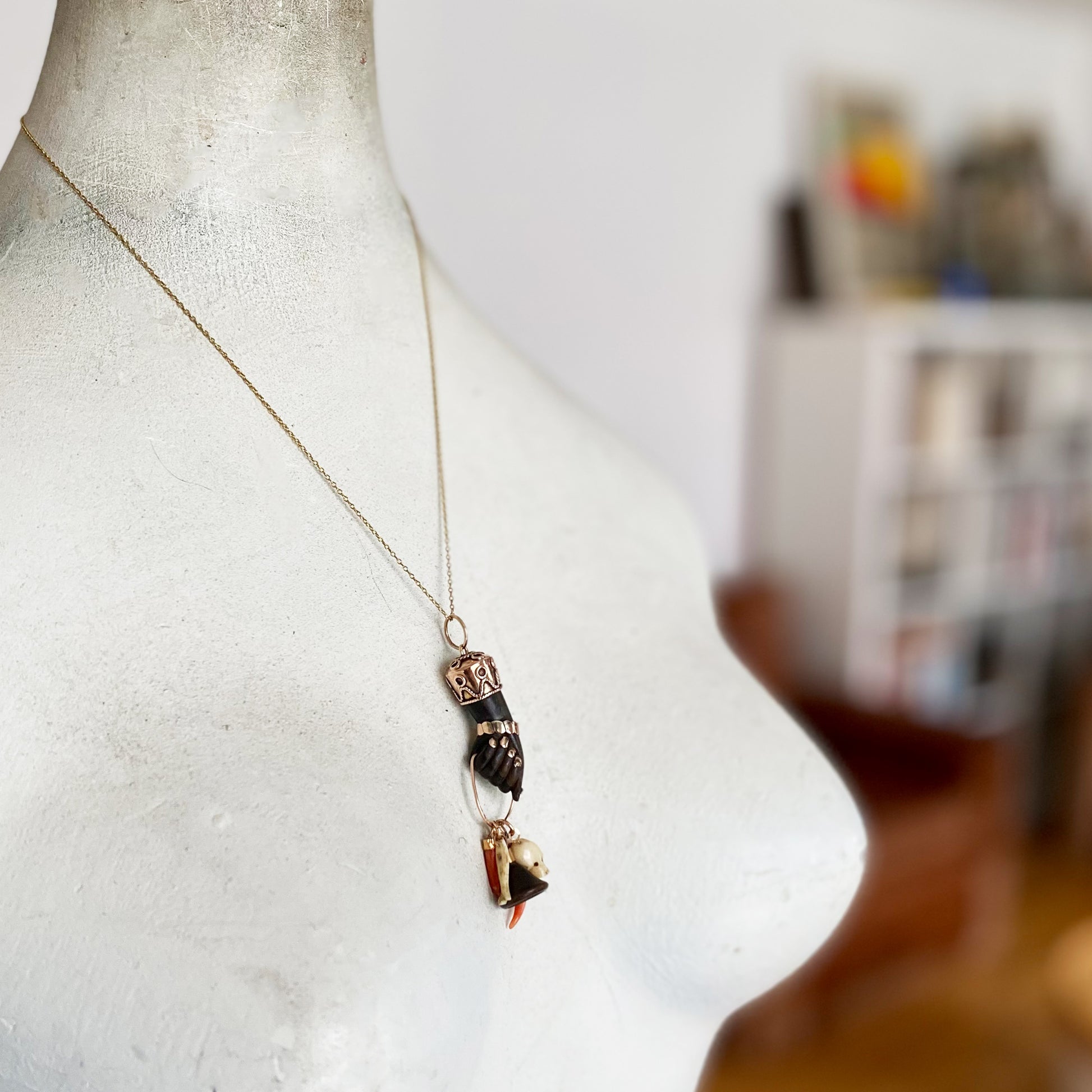 This fist pendant is made of dark stained horn and it's mounted on a gorgeous 9k rose gold embellished cap. It has a beautiful 9k gold bangle around the wrist and 9k gold nails (no hallmarks - acid tested positive as 9k gold).