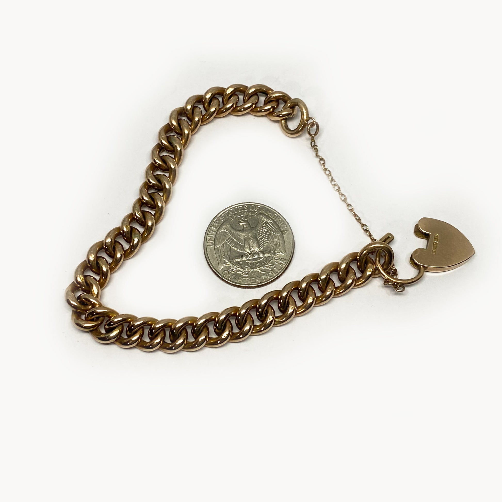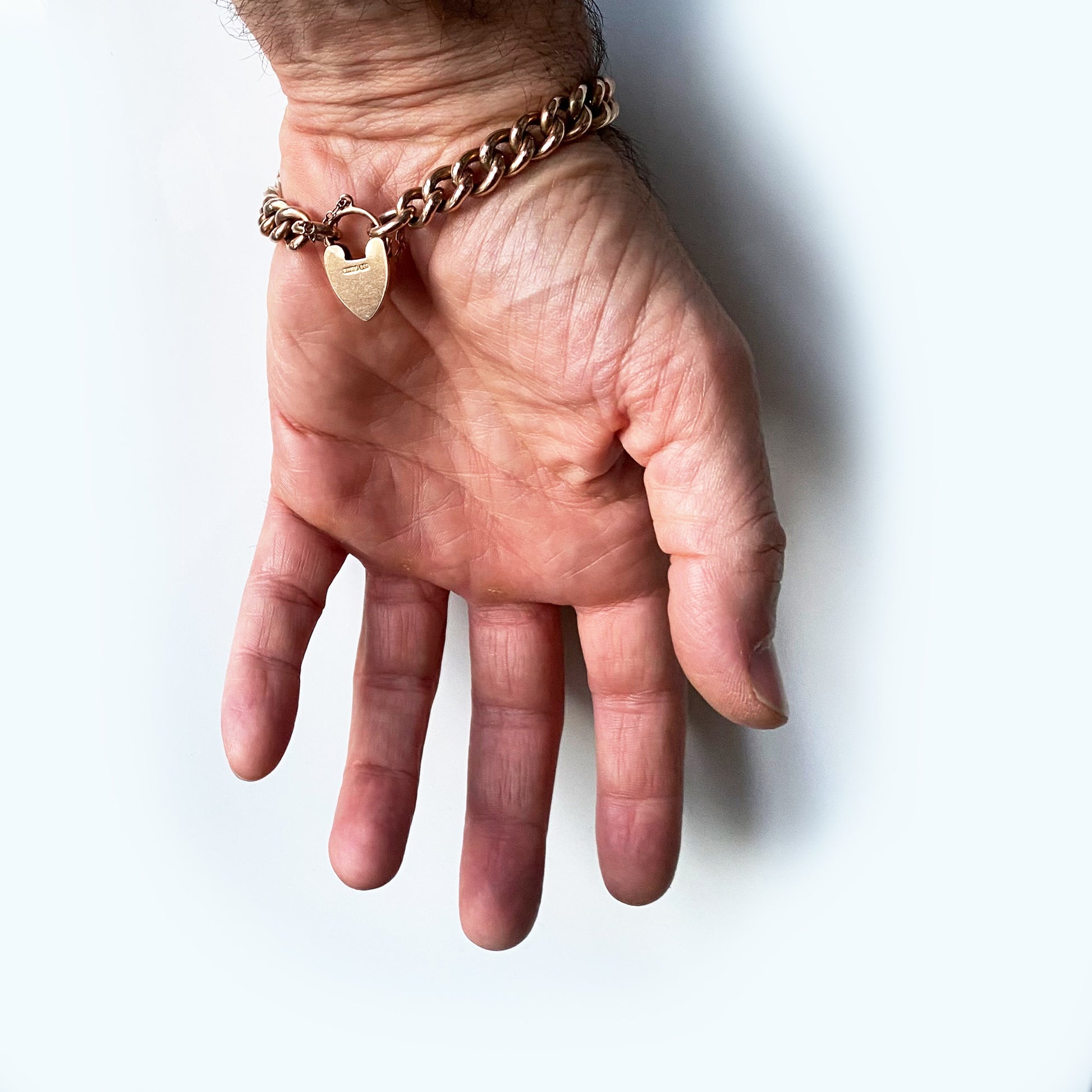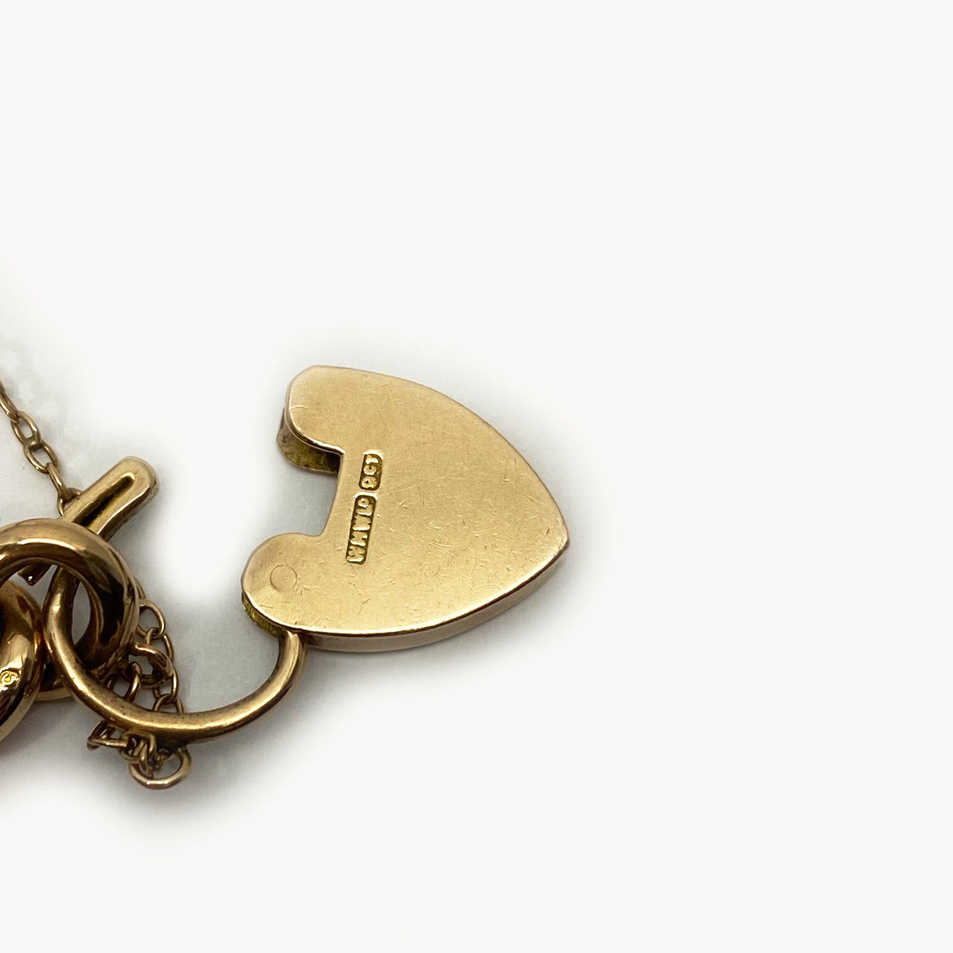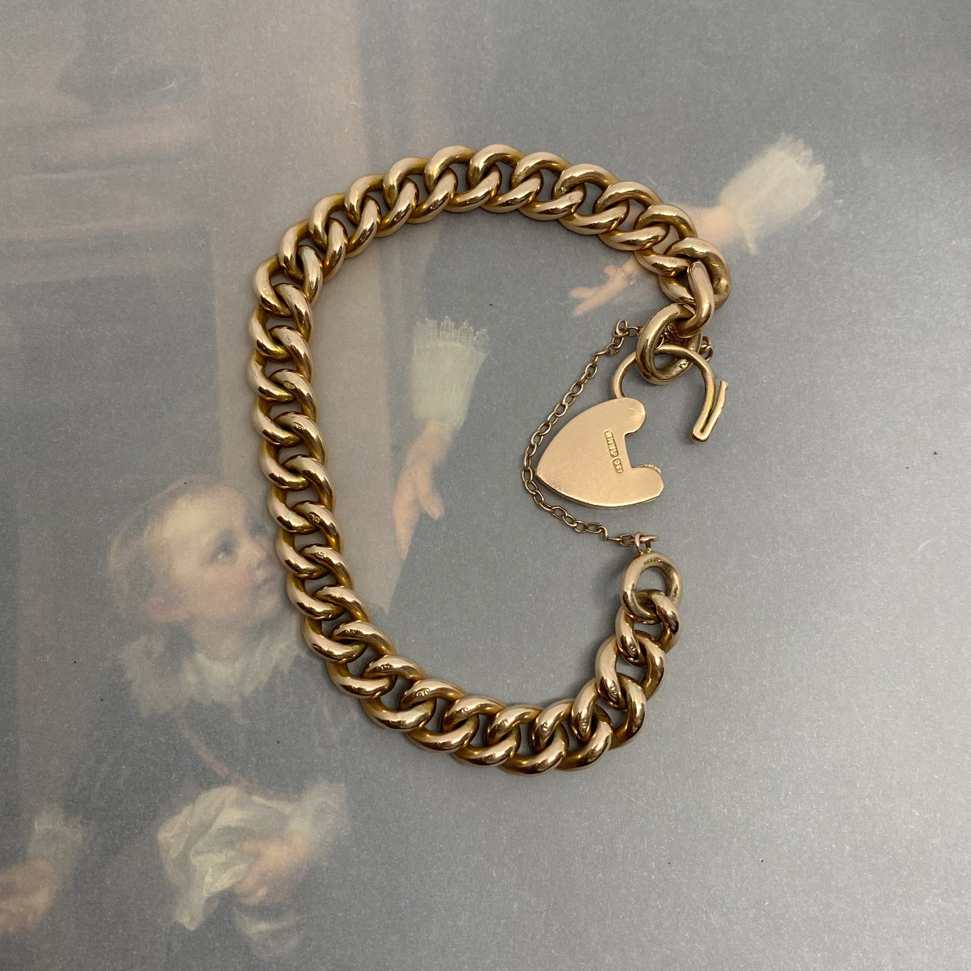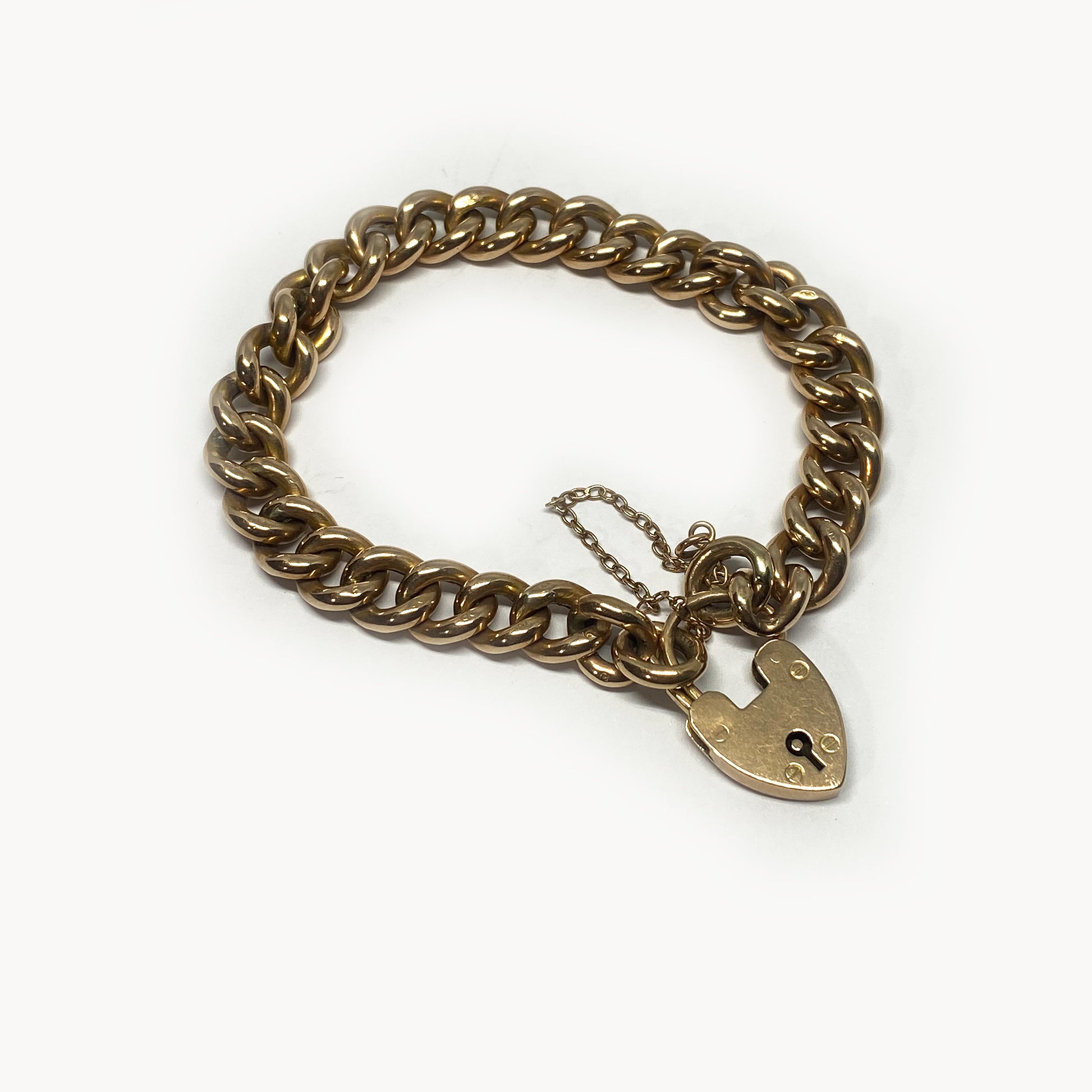 Dating back to the 1930s, this bracelet features a heart padlock clasp with a 9k stamp on its back. Each link is adorned with a 9c stamp, and the gold has been acid tested positively as 9k gold.