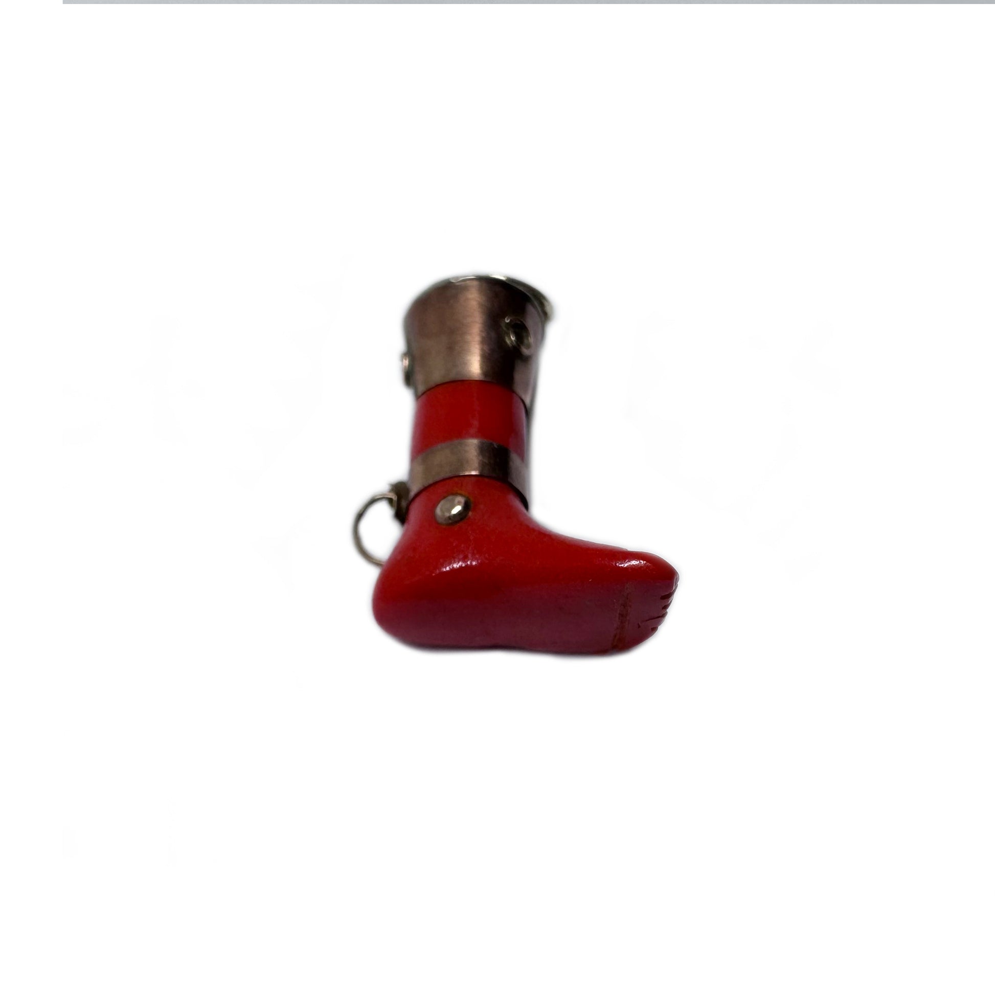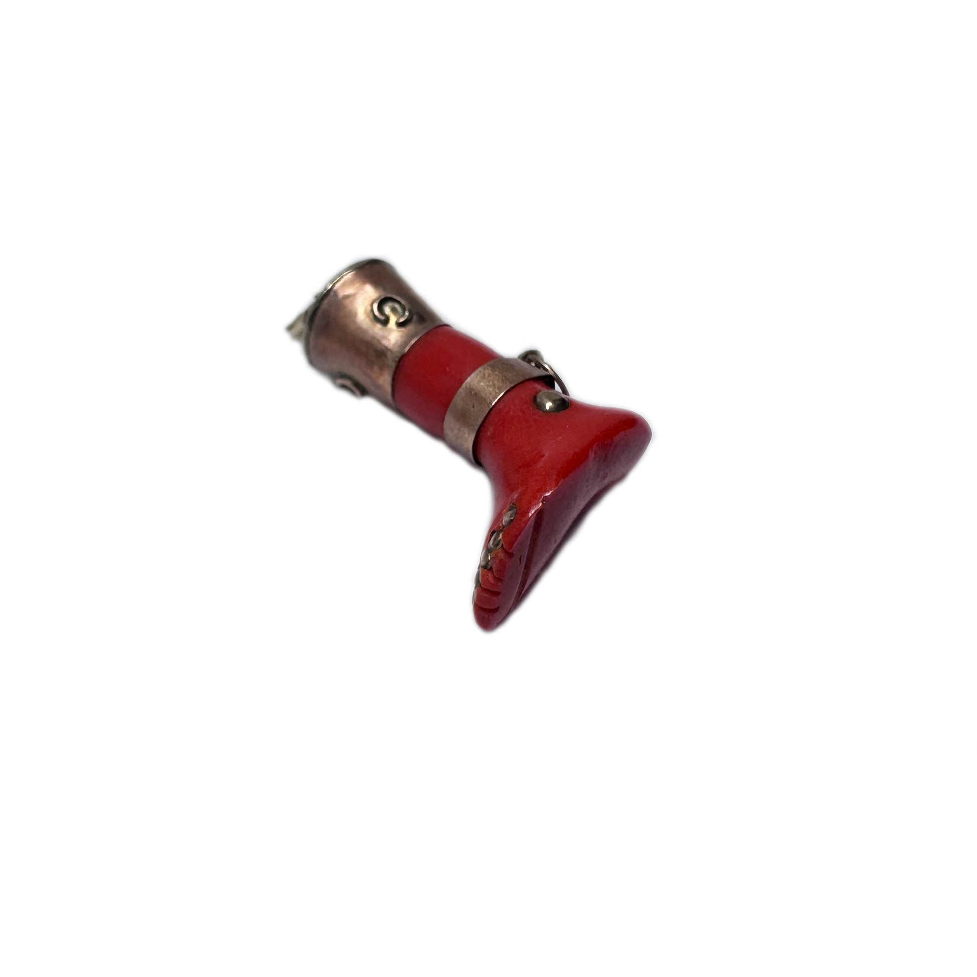 An intriguing and unusual antique leg pendant, crafted from red-orange Bakelite and dating to the 1940s. This small ex voto charm features a detailed 9k rose gold case, a delicate anklet and gold nails beautifully embodying the fusion of religious devotion and decorative craftsmanship. (No hallmarks - acid tested positive as 9k gold).