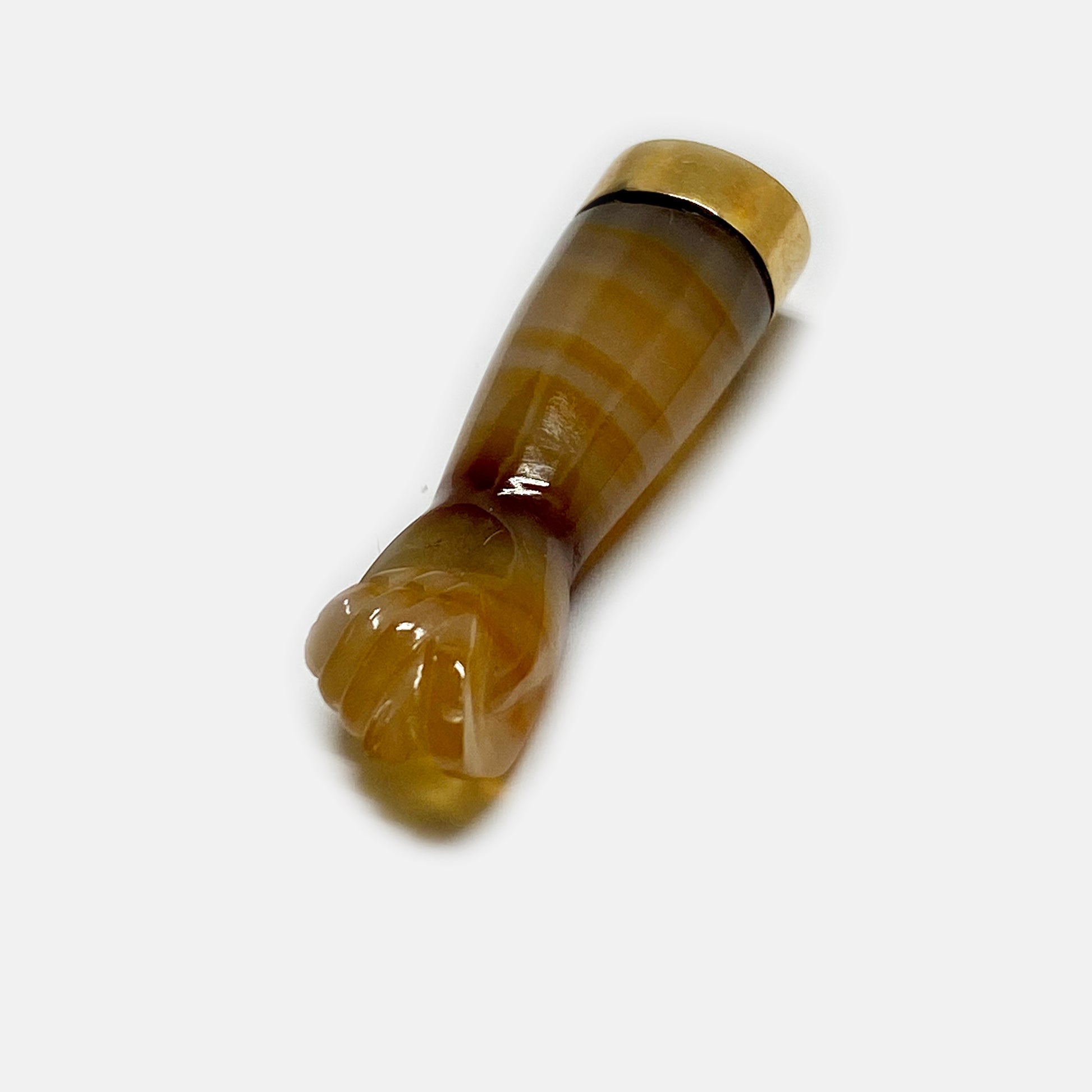 The hand charm is mounted on a 14k gold base with a 14k gold bail. (No hallmark - acid tested positive as 14k gold).