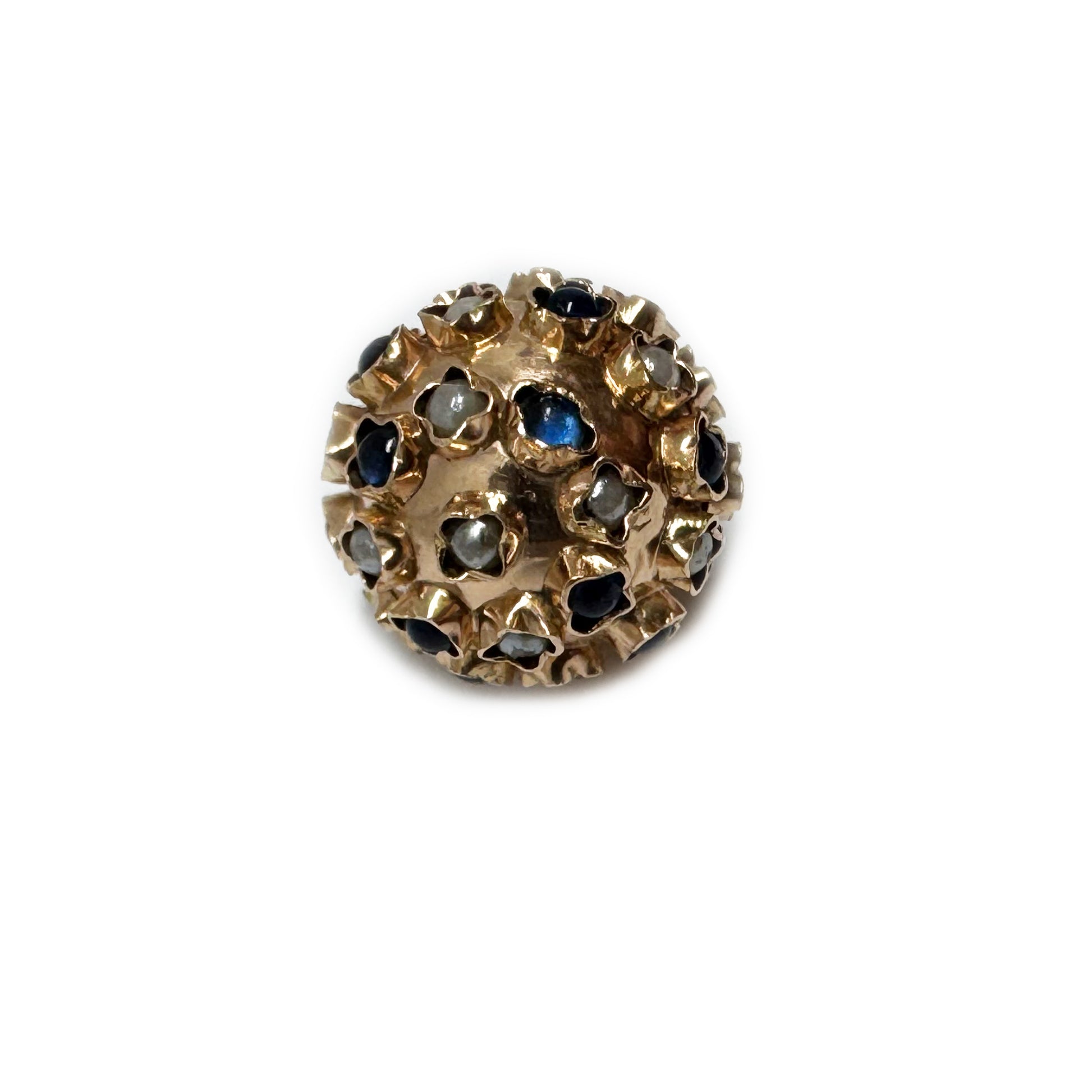 This beautifully detailed piece features a fluted conical base crowned by a bouquet-like cluster of star-set blue stones and white pearls, a design typical of northern Portuguese jewellery from the Victorian and early 20th century periods.