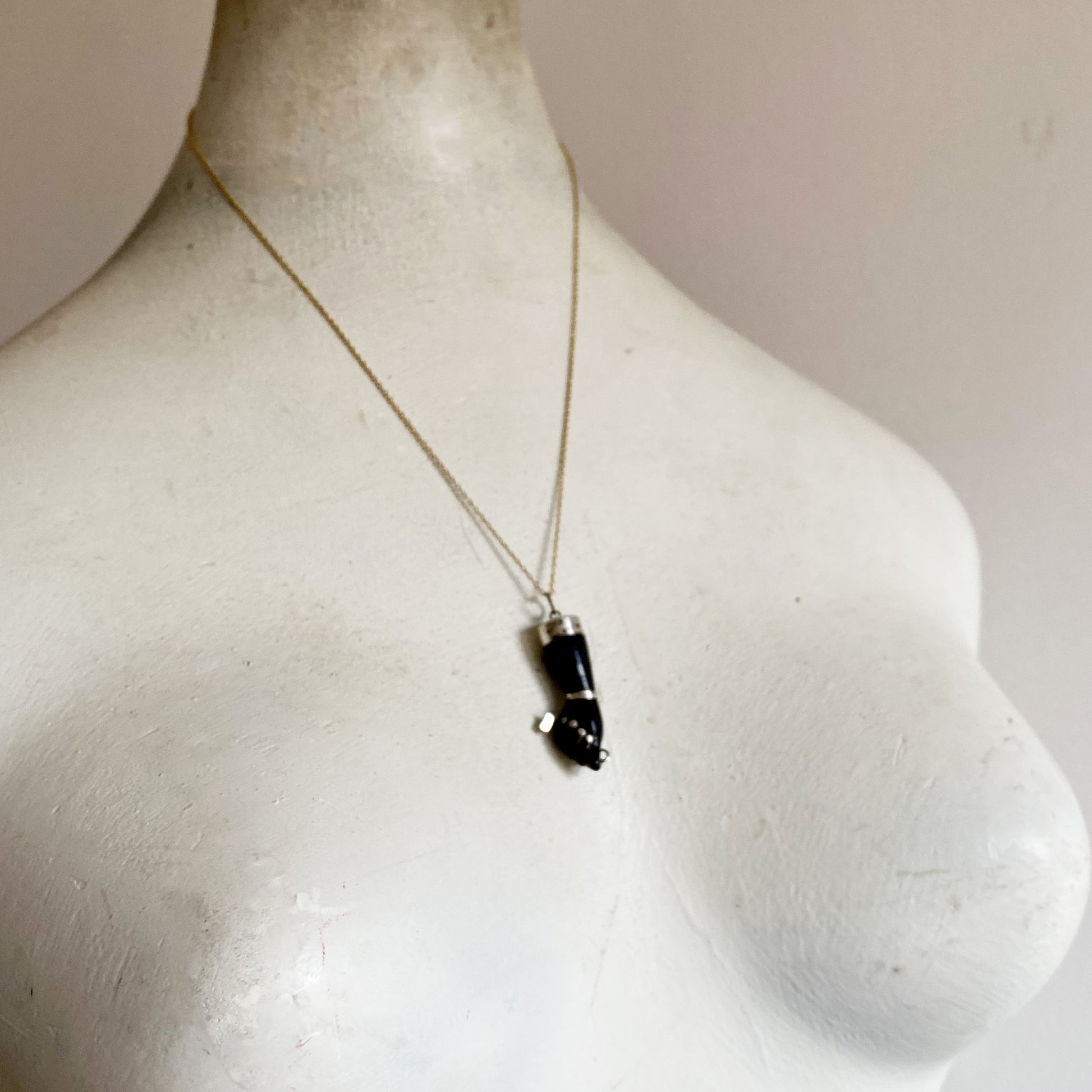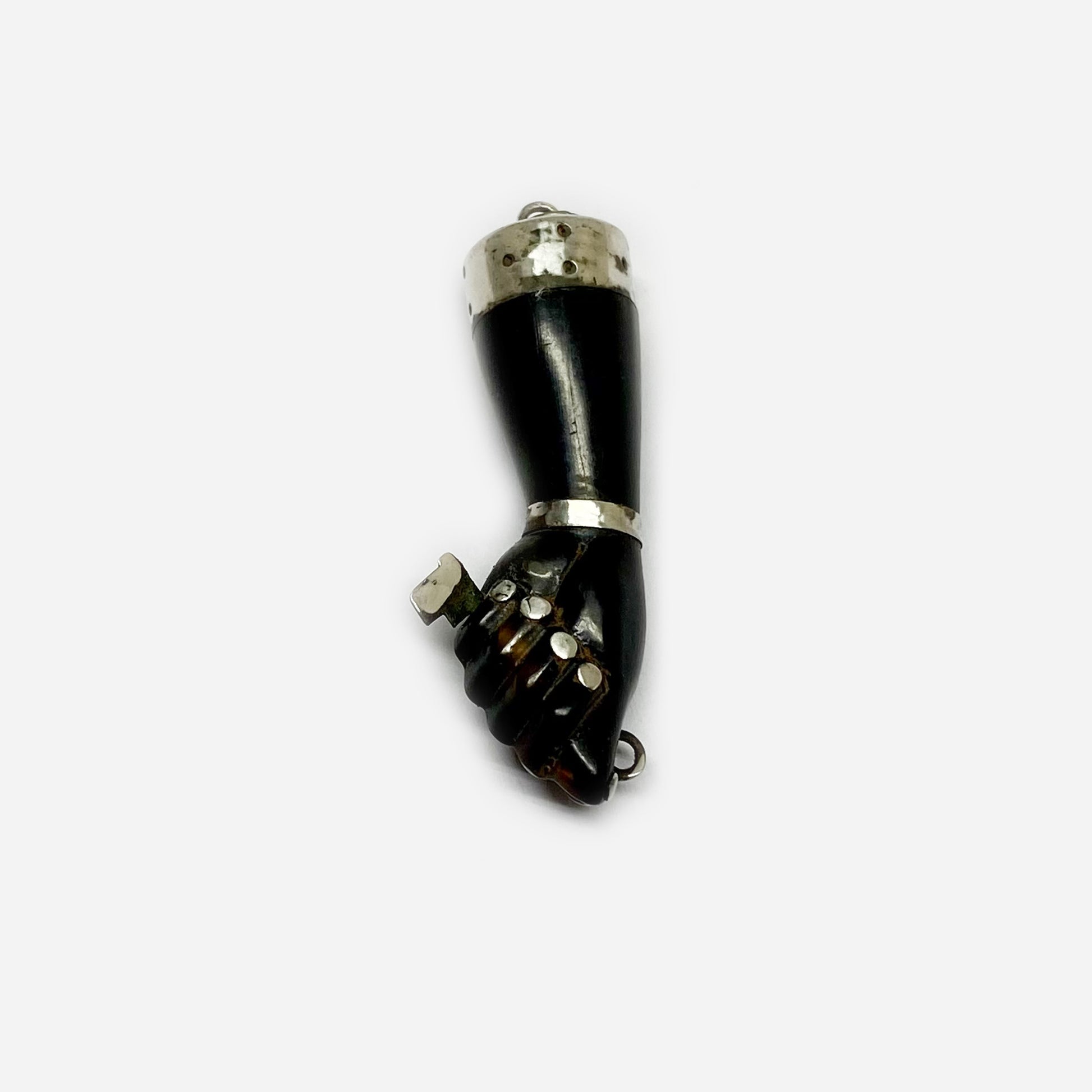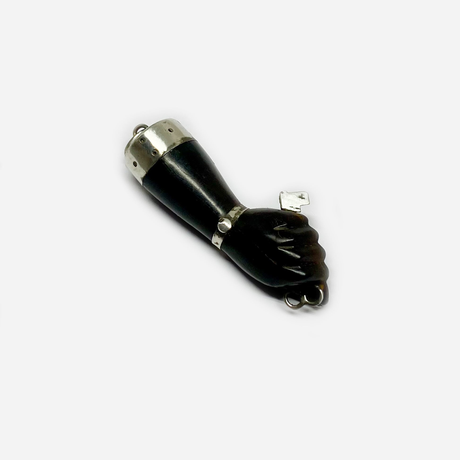 An evocative dark brown stained horn 1950s hand pendant with a silver tone base, a bracelet around the arm, nails and holding a key.