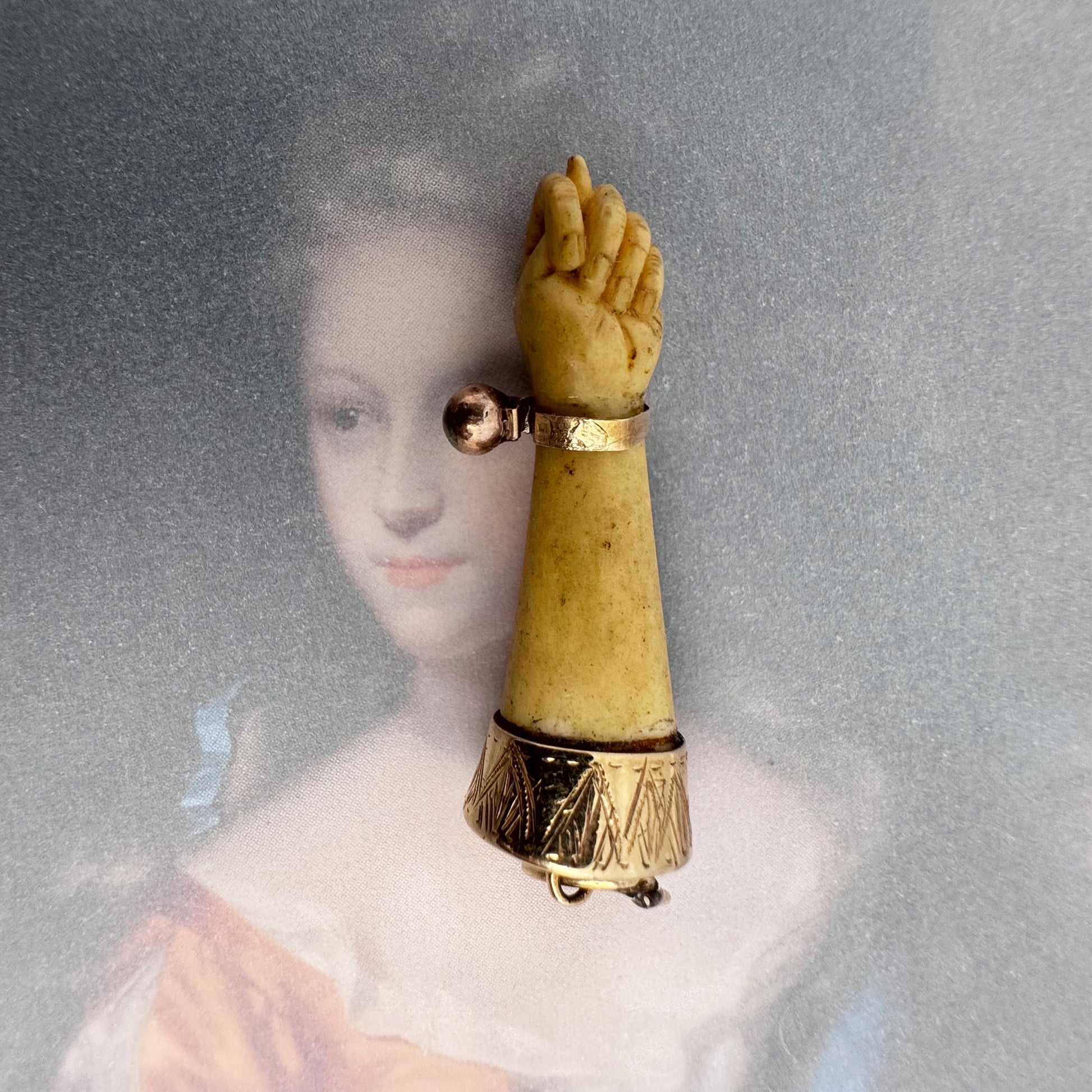 A captivating antique Victorian figa hand pendant, finely carved from bone and mounted in warm 14k gold with delicate embellishments. This evocative piece dates to the mid-Victorian period, a time when jewellery was rich in meaning and worn as much for protection as for beauty.