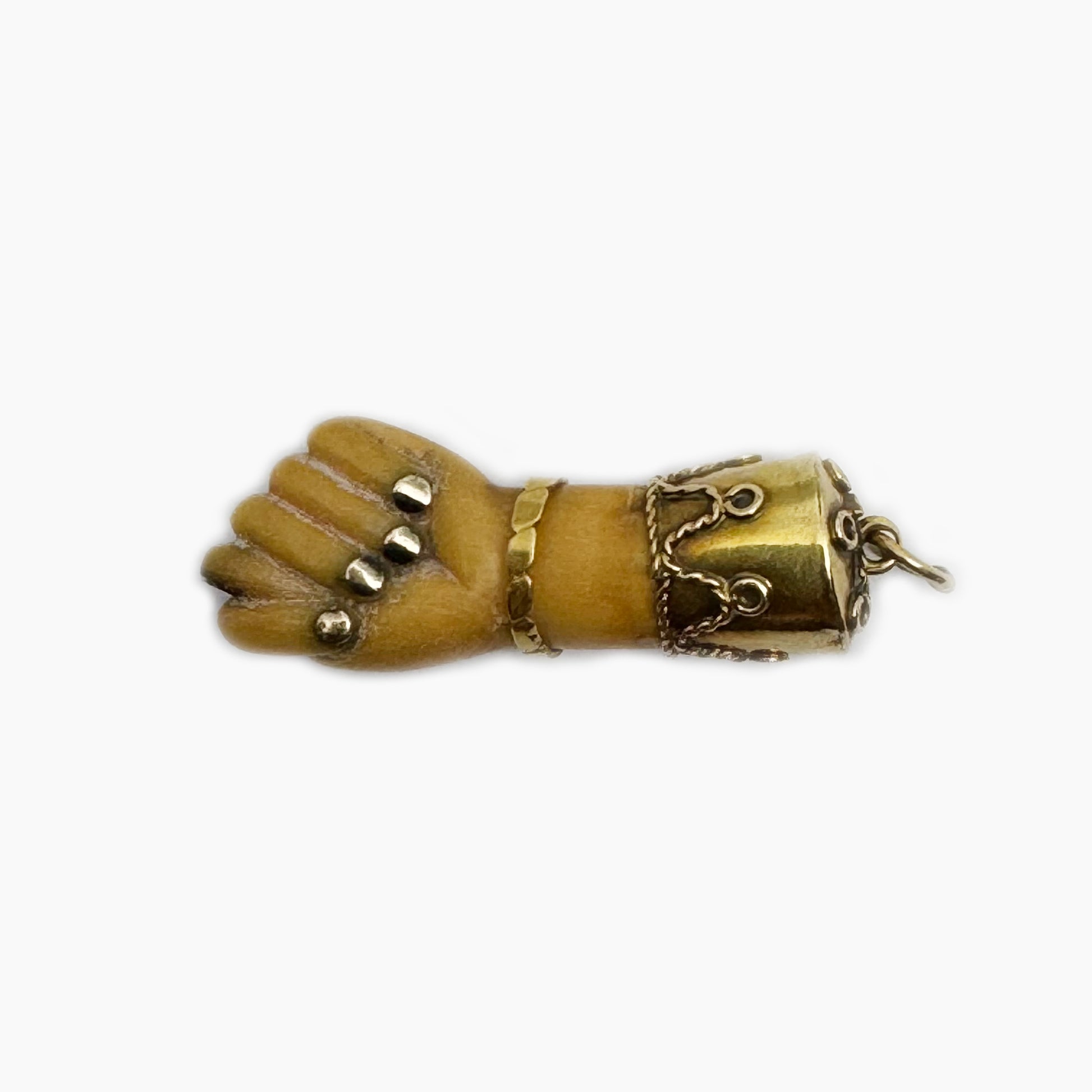 Antique Victorian Bone Figa Mano Fico Pendant, 18k Gold Mounted Hand Amulet, c.1800s Lucky Charm