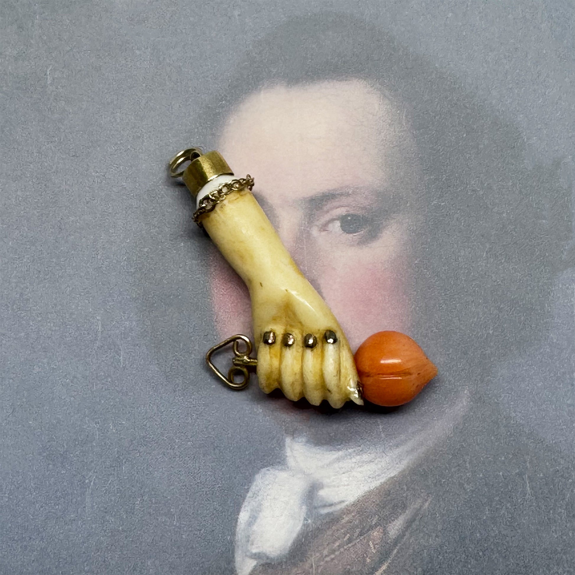 A beautifully crafted late Victorian figa pendant, carved from natural bone and decorated with solid 9k gold accents. It has a case with a fixed a slim chain bracelet, and individually applied gold nails that give the hand remarkable character and detail.