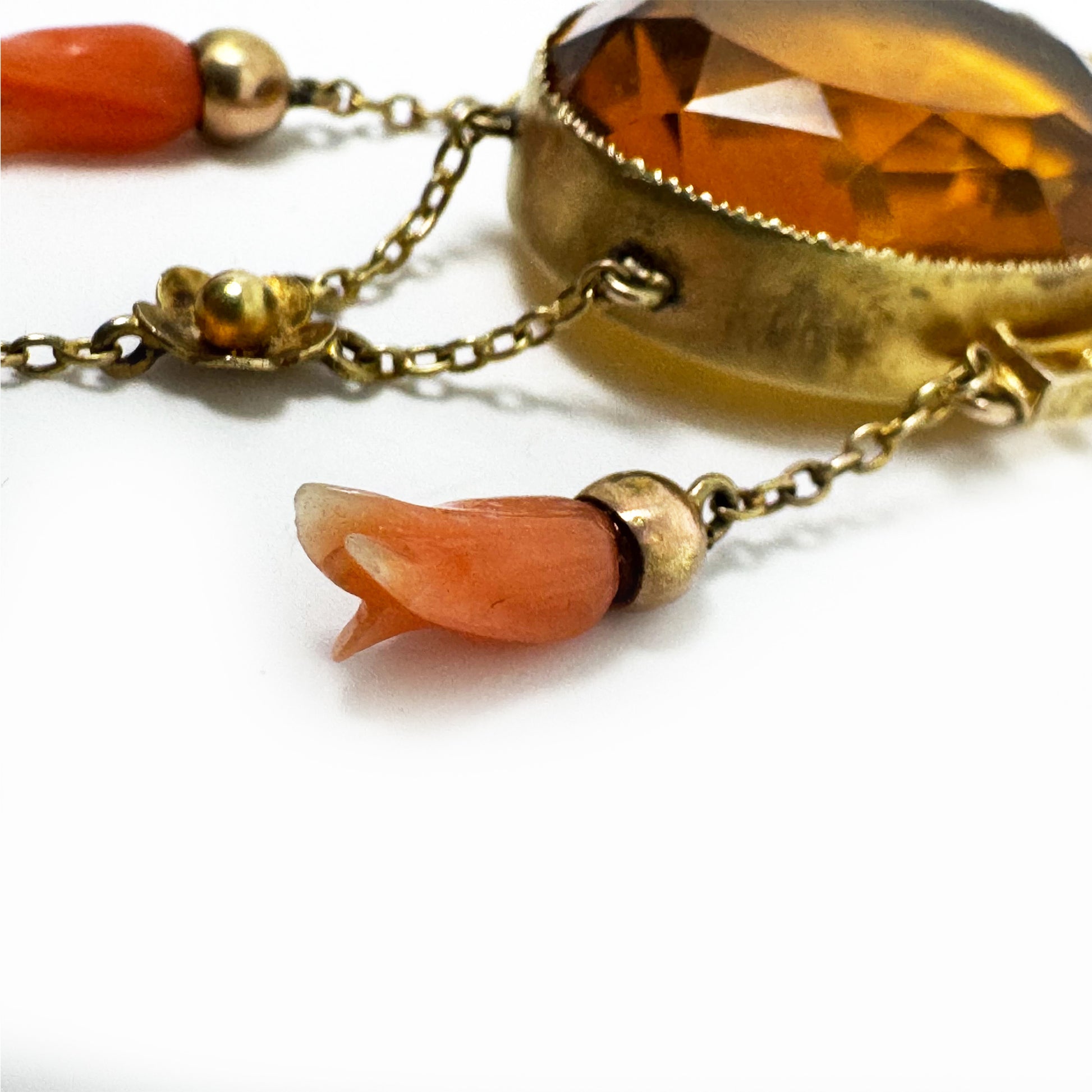 Edwardian 9ct Gold Festoon Pendant, Coral Bud Drops, Citrine Colour Glass Stone