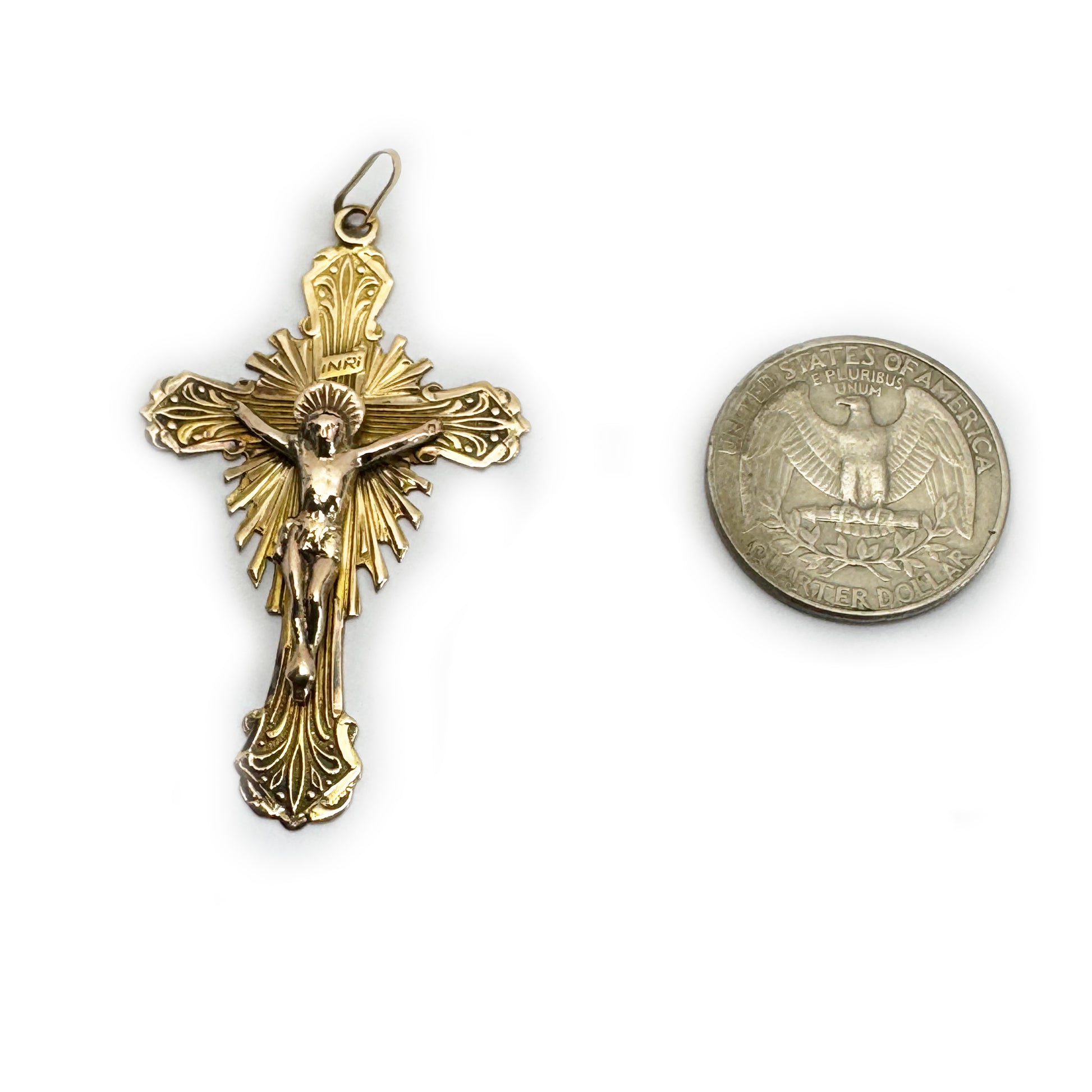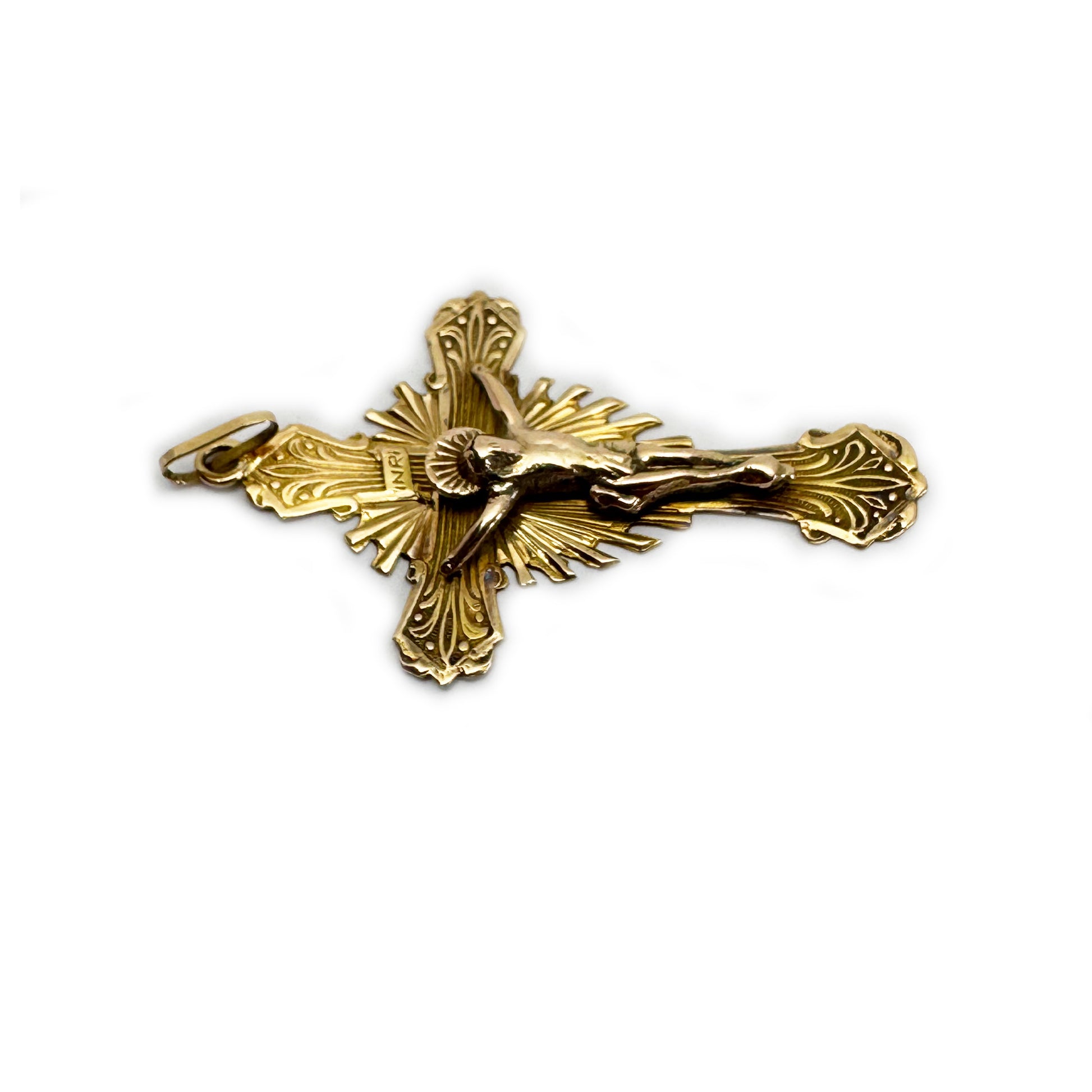 Measuring approx. 6 cm in length (including the bail) by 3.2 cm wide, and weighing 5.3 grams of gold, this European cross reflects the craftsmanship and symbolism cherished in continental religious pieces.