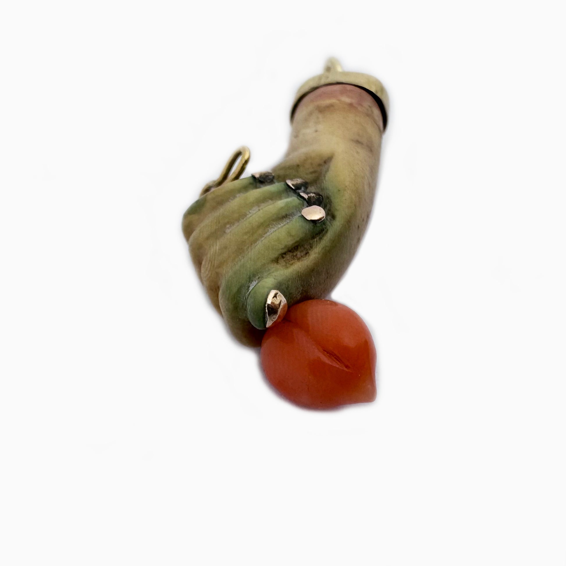 Victorian Bone Figa Pendant, 9k Gold & Coral, Mano Fico Amulet