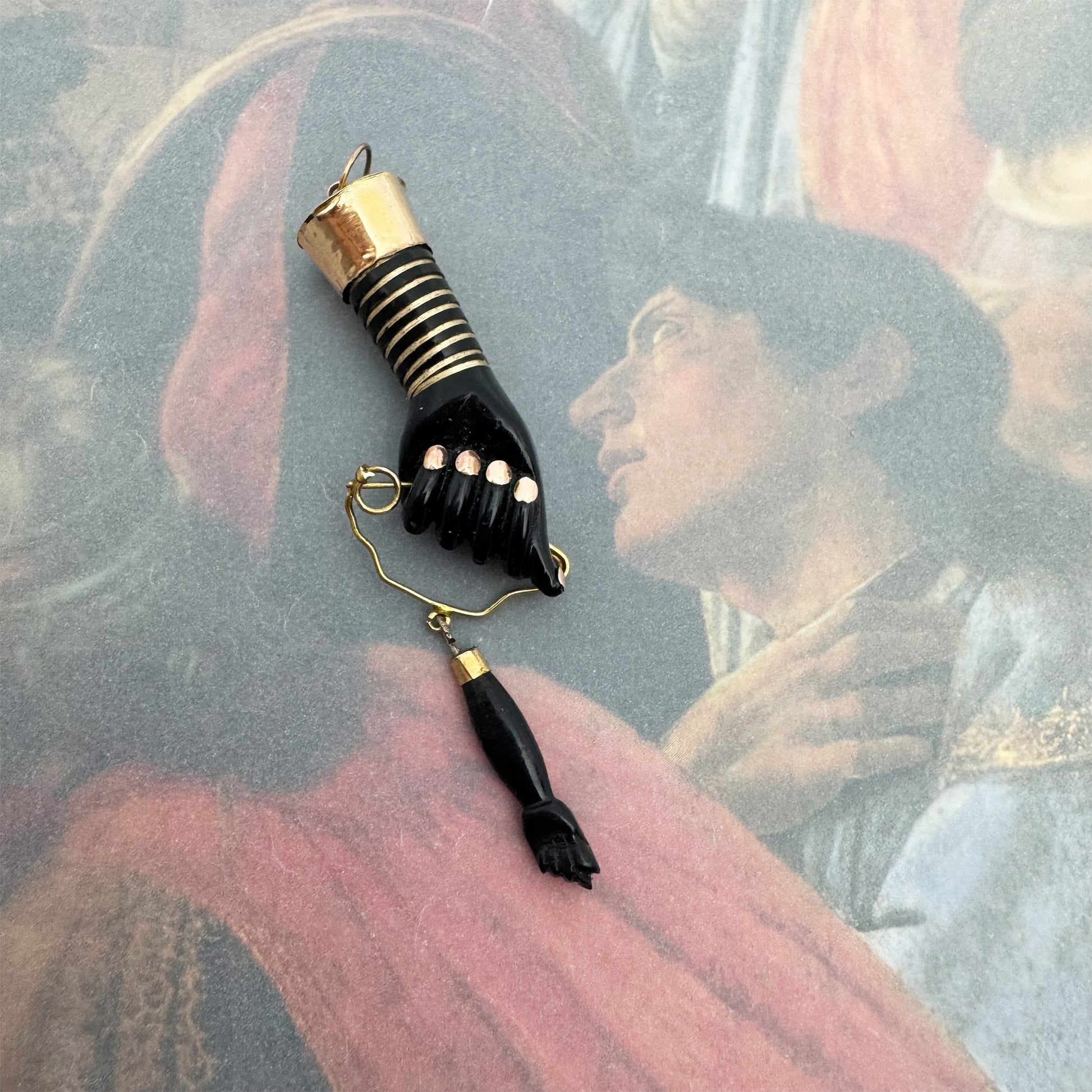 The fist pendant is made of resin (possibly bakelite) and is mounted on a 14k gold case, with a 14k gold arm bracelet - no hallmarks - acid tested positive as 14k gold.