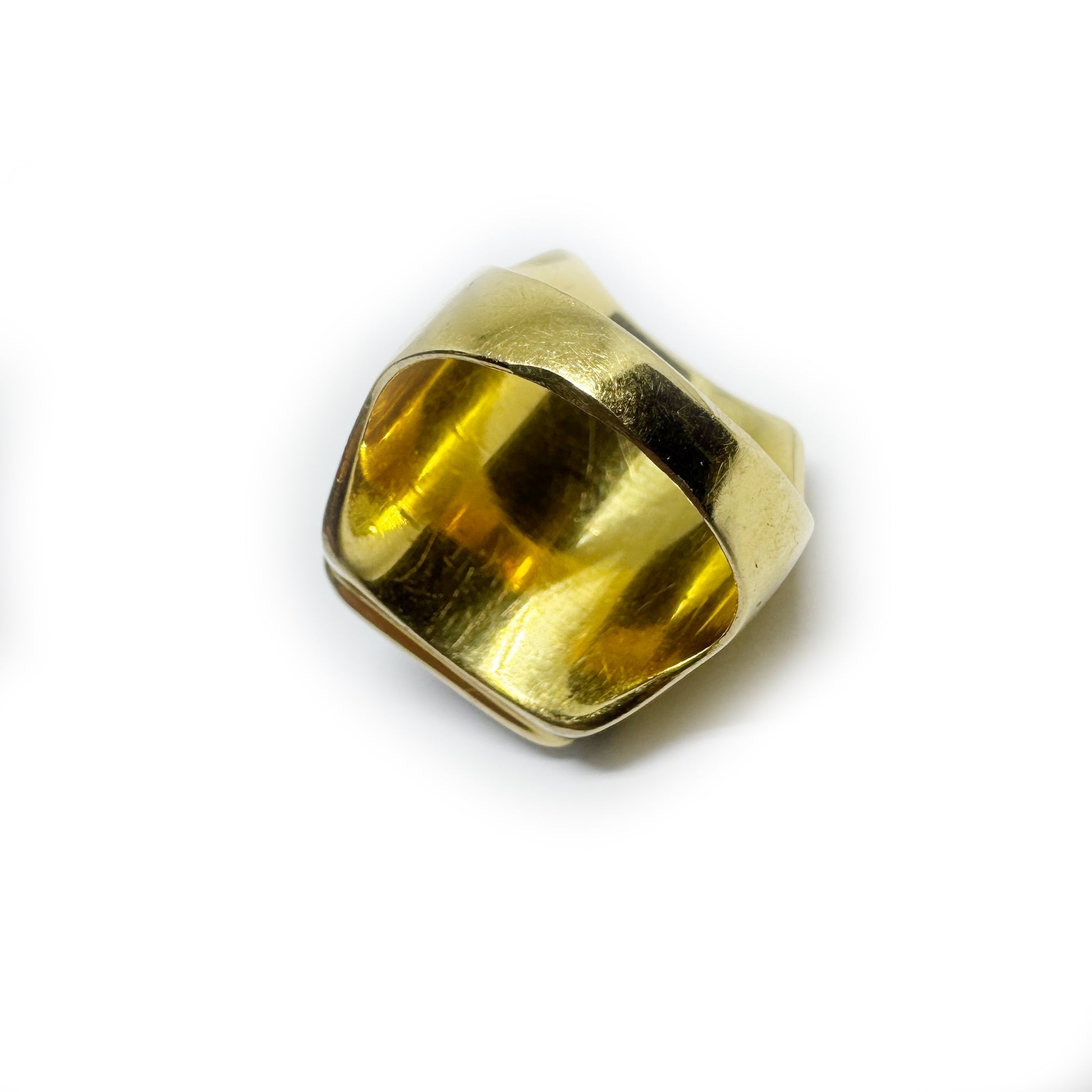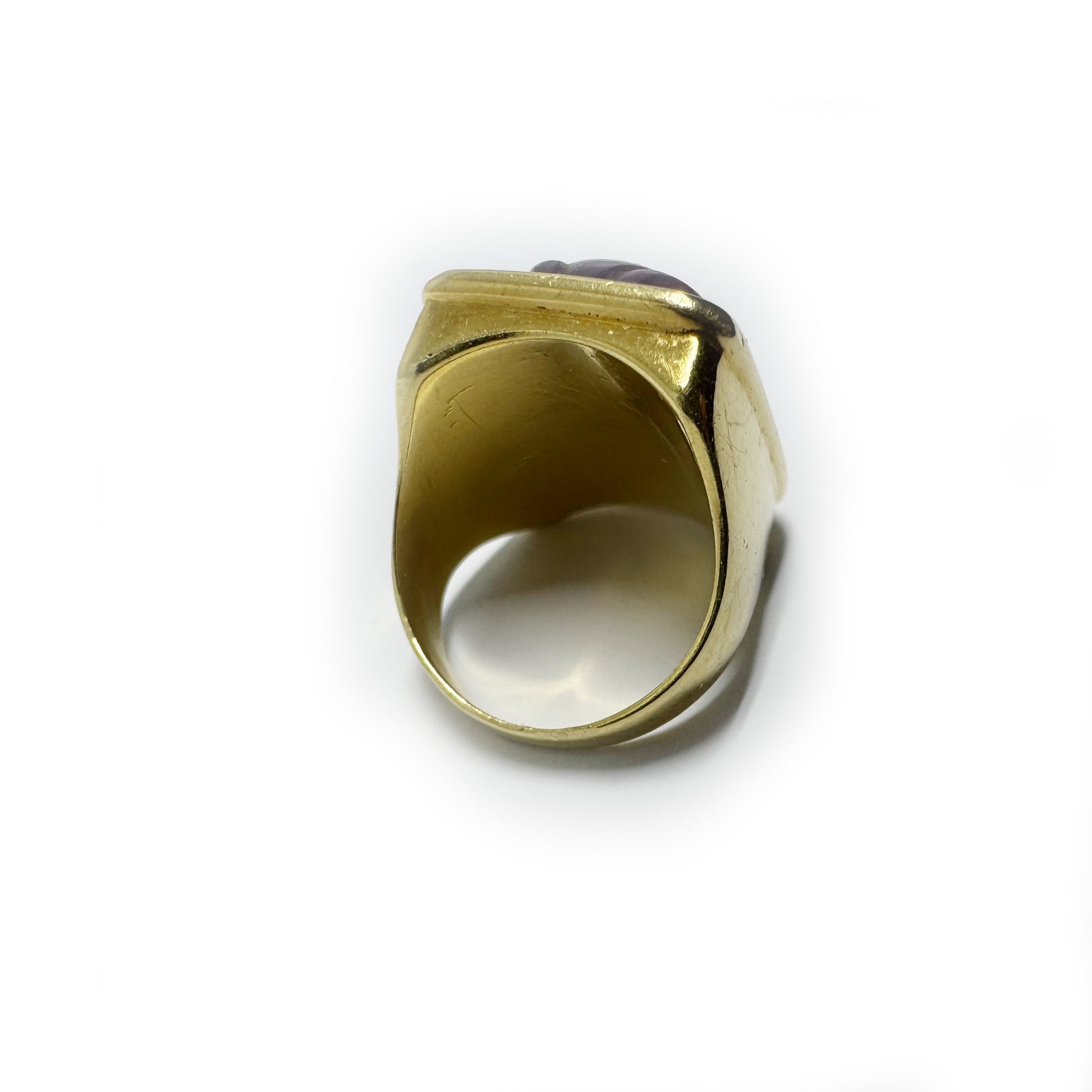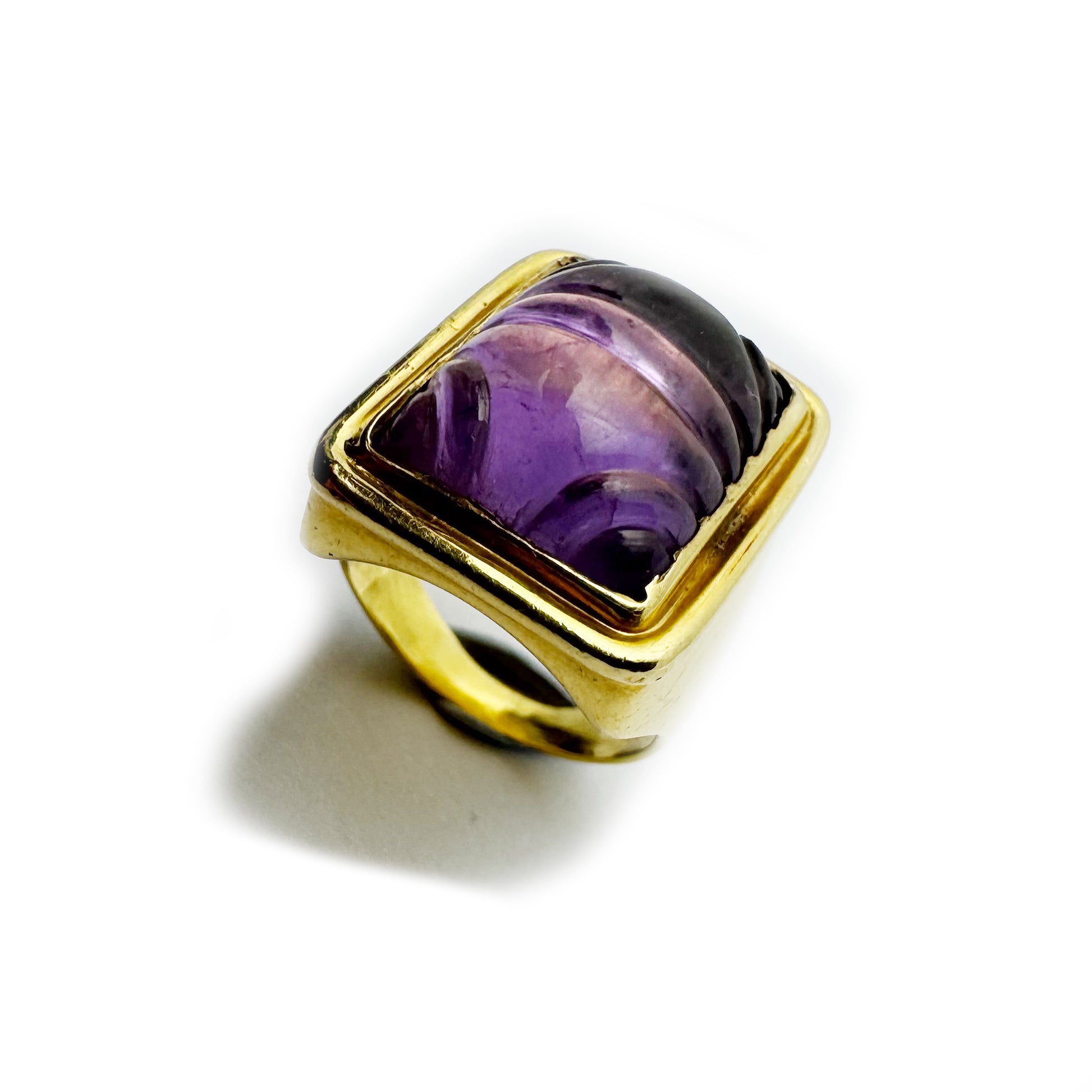 A bold and sculptural midcentury ring crafted in solid 18k gold, showcasing a deeply carved amethyst cabochon in a geometric bezel setting. Though unsigned, this design bears all the hallmarks of the distinctive style attributed to renowned designer Burle Marx, celebrated for his abstract forms and rich Brazilian gemstones.