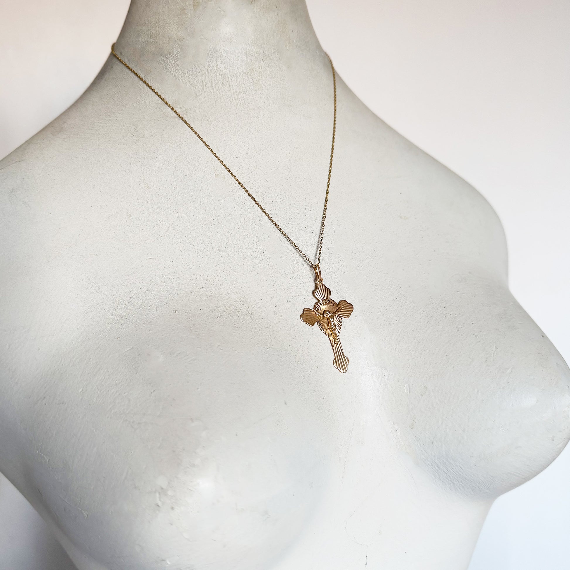 A truly exquisite 1950s continental crucifix pendant crafted from solid 18k gold, featuring a powerful halo and raised depiction of Christ.