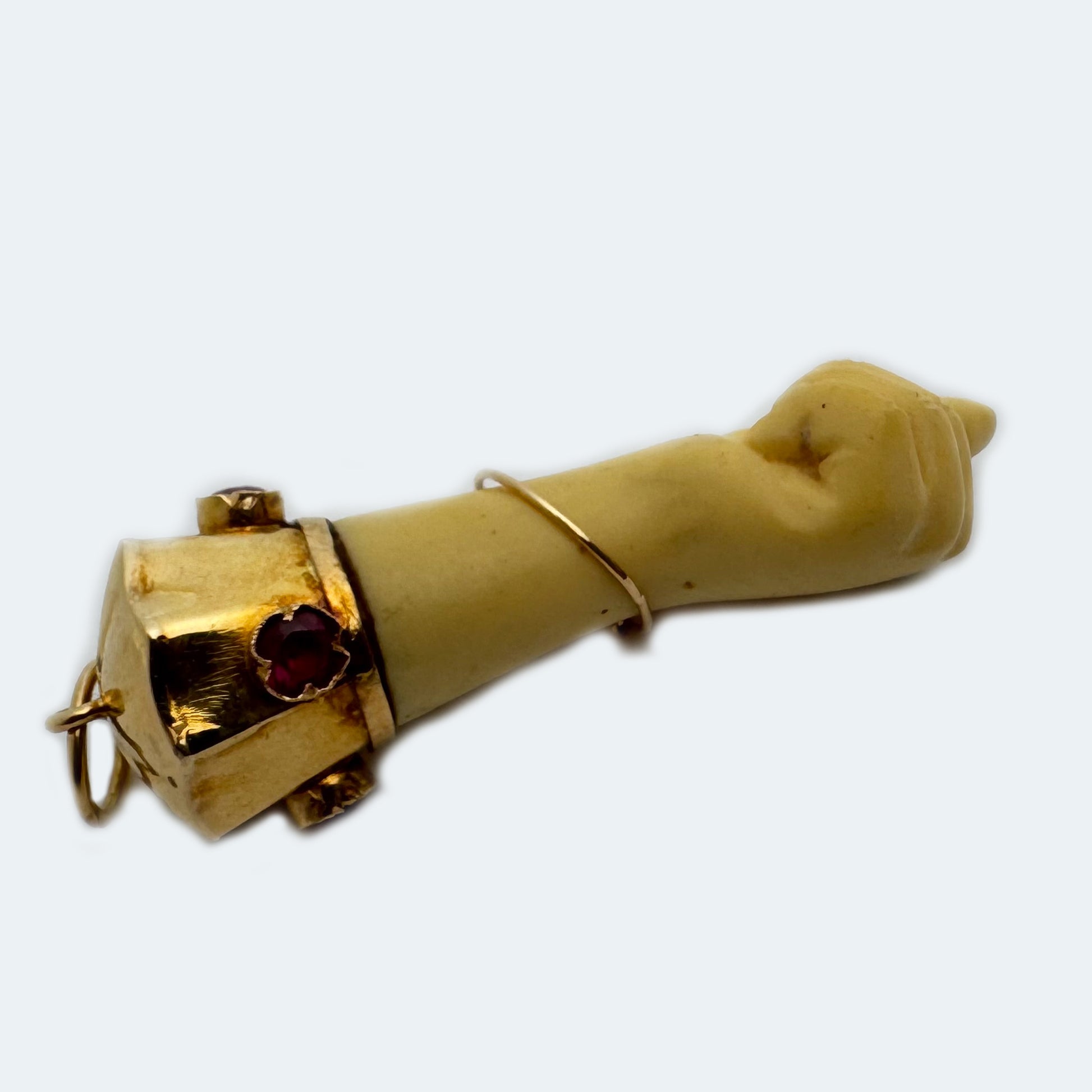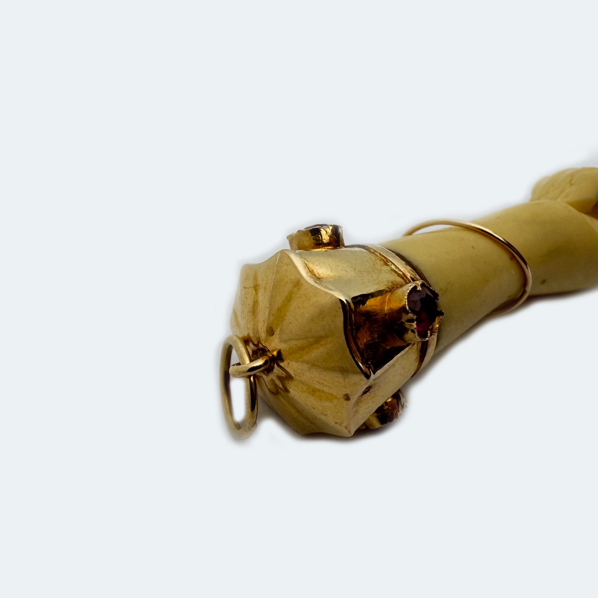 A striking vintage 18k gold Figa hand pendant, beautifully crafted in the 1960s and mounted in an ornate gold casing set with vivid pink stones (not tested). The hand itself is made from an early bone-toned material, likely celluloid or galalith, both popular in mid-century jewellery for their smooth finish and elegant appearance.