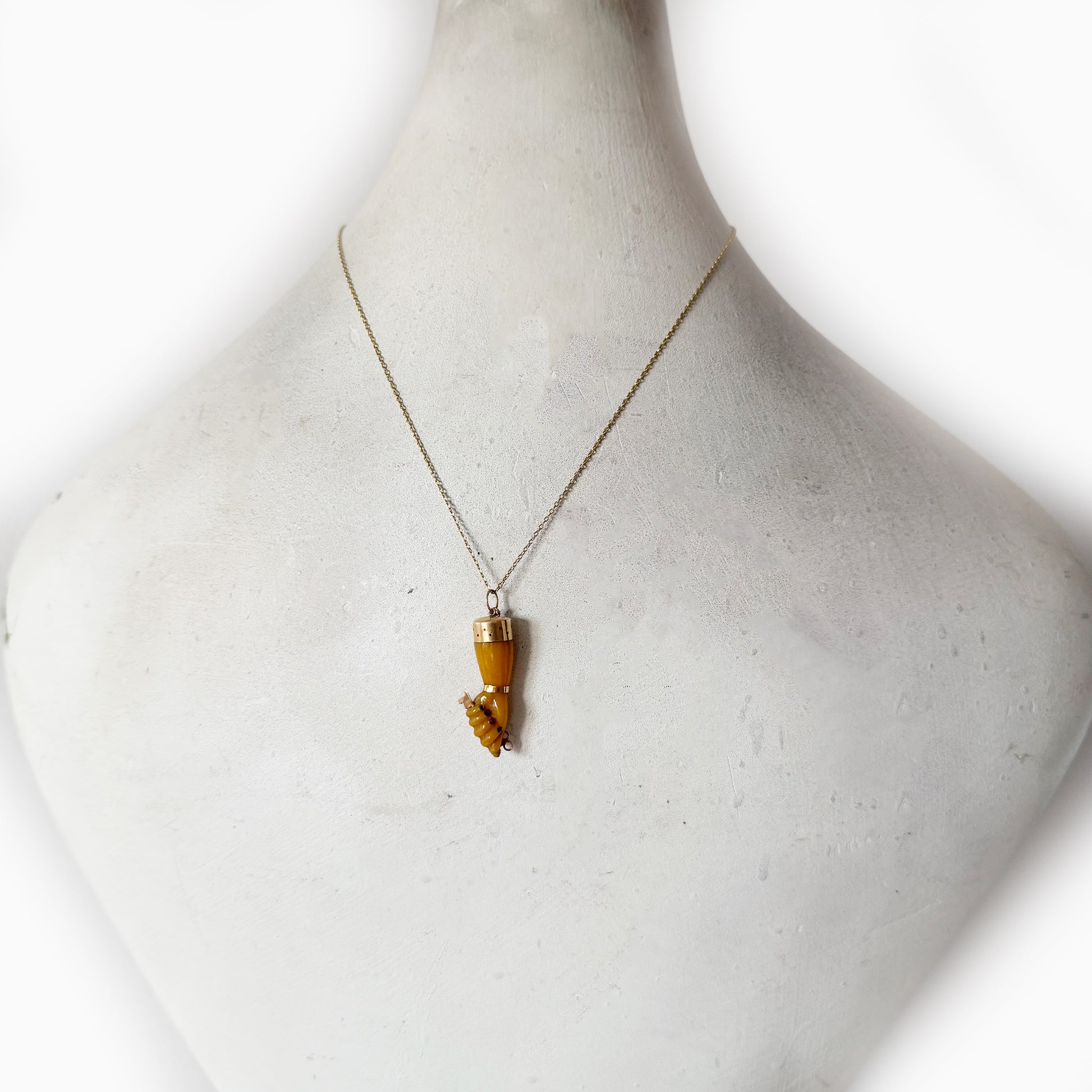 A wonderfully characterful vintage figa pendant dating to around the 1960s, carved in a warm yellowish, caramel tone and mounted mounted in an ornate 18k gold setting with a soft, warm tone that sits beautifully between yellow and rose gold. The sculpted hand forms the classic fist gesture, known as the figa or mano fico, a powerful old-world talisman traditionally worn for protection, luck and warding off the evil eye.