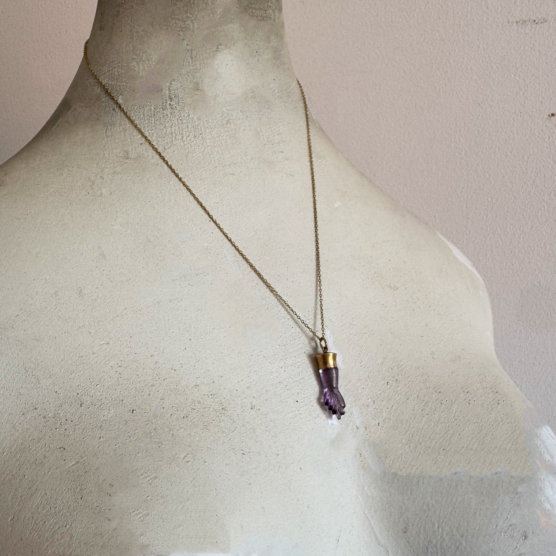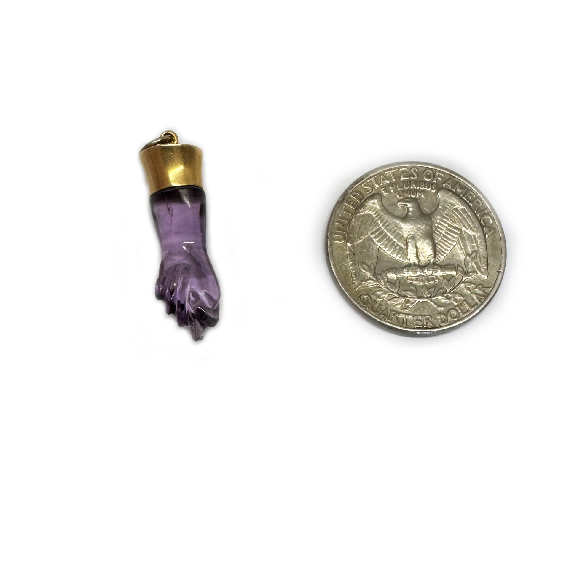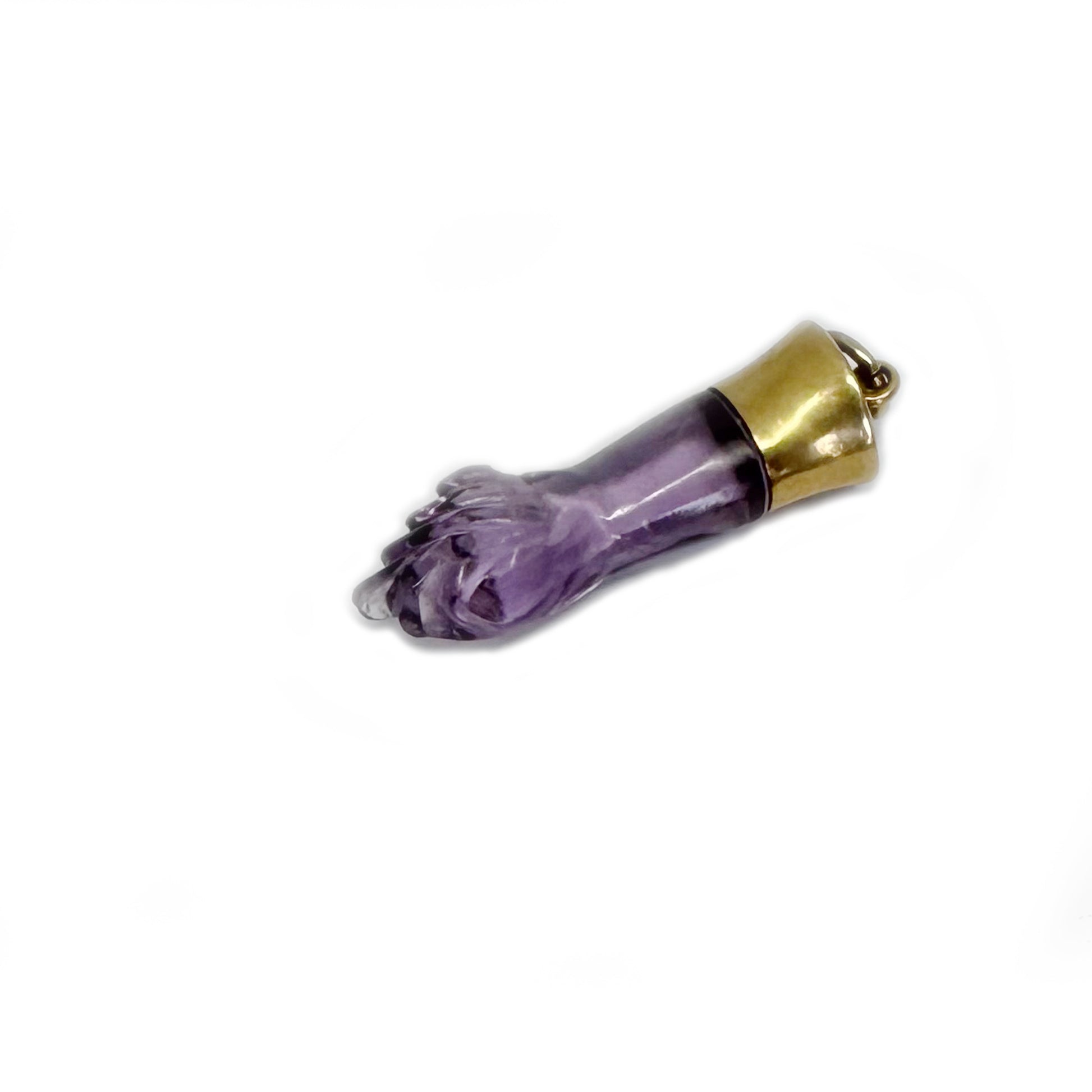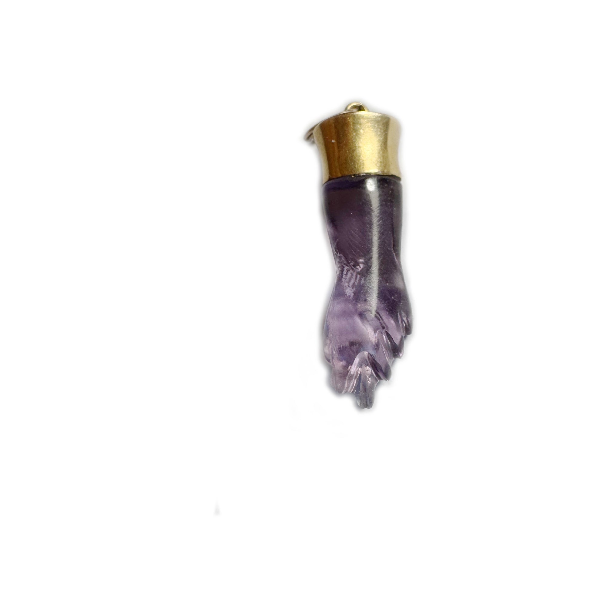 Beautiful 1950s carved purple tone hand pendant mounted on an 18k gold case.