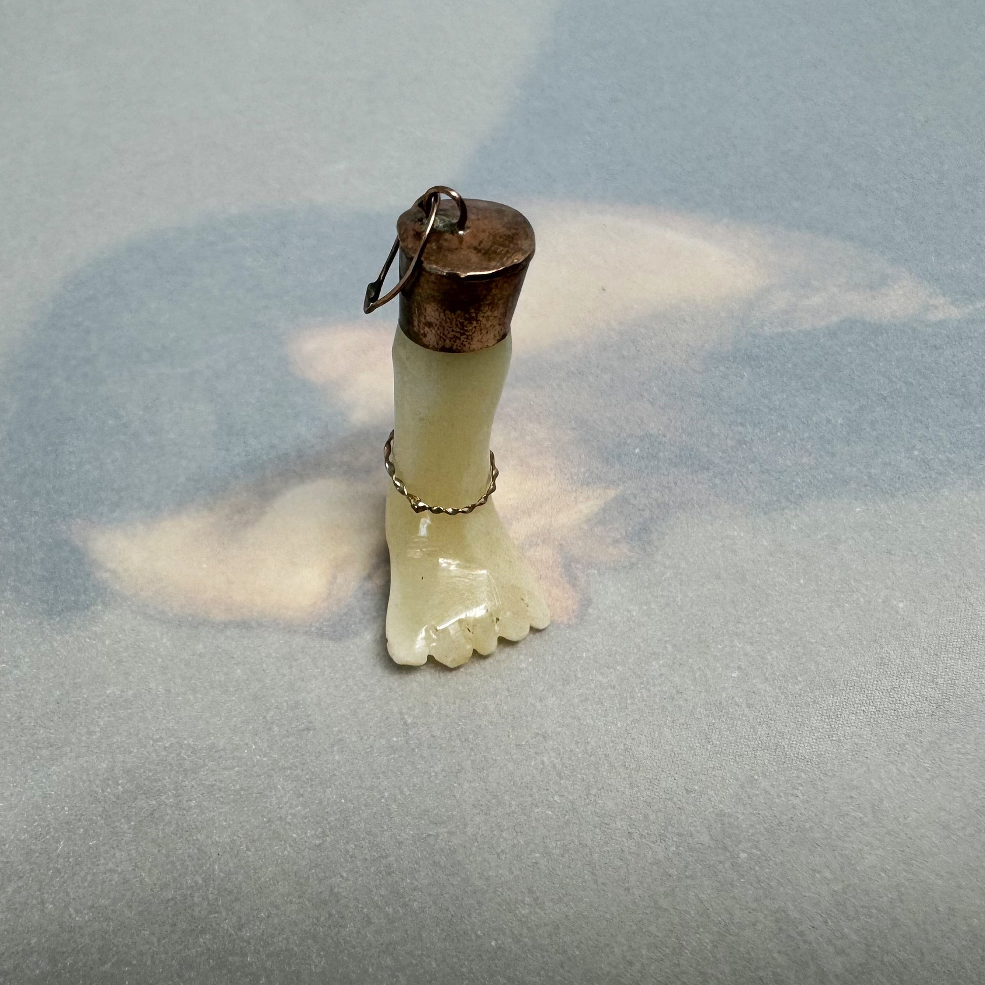 A distinctive vintage 1950s resin leg pendant, designed in the style of traditional ex-voto and folk amulets. This sculpted foot charm features a gold-plated metal cap and a twisted metal anklet detail, creating a small but striking anatomical piece with plenty of character.
