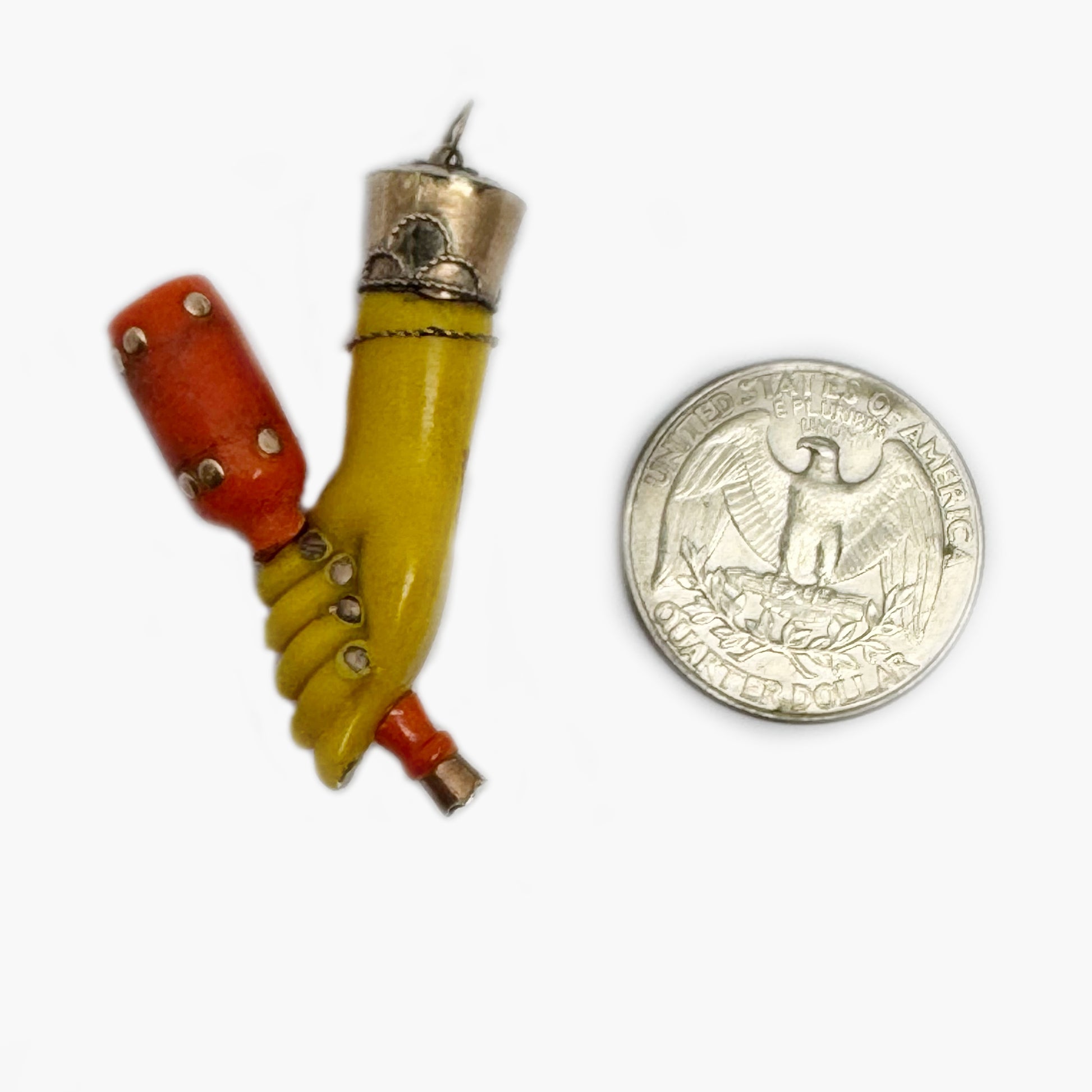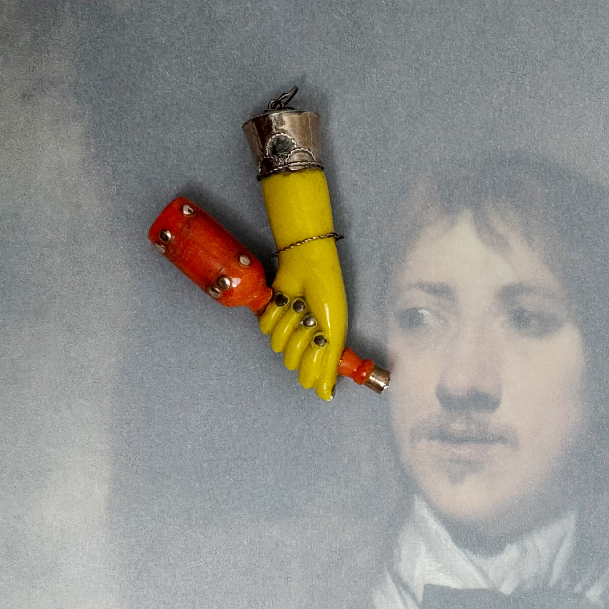The symbolism is intriguing. Fists in jewellery often relate to protection, strength, or the classic mano fico gesture. The addition of the bottle introduces a more personal layer, possibly even reminiscent of an ex-voto offered by someone overcoming or seeking relief from drinking habits. As with many folk talismans, its meaning is open, powerful and evocative.