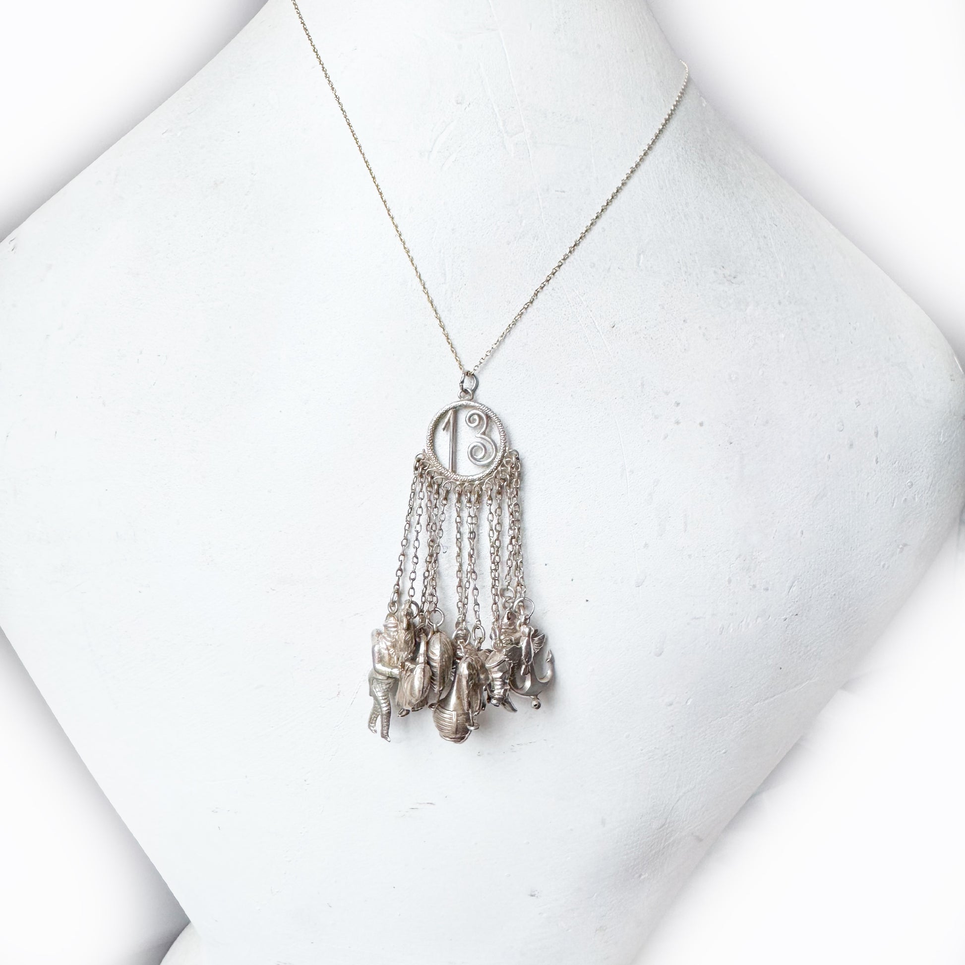 A vintage Neapolitan lucky charm pendant, featuring a radiating cluster of 13 symbolic talisman charms suspended from a central medallion marked with the number 13, a number strongly associated with luck, fortune, and superstition in Naples and Southern European folk culture.